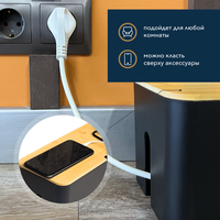 Органайзер для проводов – лучшее решение для дома и офиса. Он поможет аккуратно убрать провода, чтобы они не болтались под ногами и не портили общий вид в комнате. Наш большой держатель подходит для зарядок, сетевых фильтров и удлинителей не более 37 см. Размеры: 13,5 x 14,5 x 41 см. Корпус выполнен из пластика, на котором не остается отпечатков пальцев. Крышка сделана из качественного бамбука. На крышке есть дополнительное место для хранения роутера или полезных мелочей. Благодаря универсальному оттенку коробка впишется в любое помещение и придаст уют дому или офису. Его можно поставить под стол в спальню, гостиную, детскую, рабочий кабинет или на кухню — любую комнату, где нужно спрятать провода. Ящик защитит их от влаги и пыли, облегчит уборку и улучшит общий вид интерьера. С хранением проводов в контейнере больше не надо тратить огромное количество времени на протирание каждого провода по отдельности. Он надежно защищает маленьких детей и животных от включенных электроприборов. С обеих сторон короба есть отверстия для удобного вывода проводов. К тому же, эти отверстия помогают воздуху не задерживаться внутри и циркулировать предотвращая перегорание электрических элементов. Наш бокс – это отличная защита электроники от заломов, так как провода меньше будут перегибаться и не будут мешать на полу или столе. Маскировка проводов с помощью нашего органайзера — это стильно, аккуратно и безопасно.