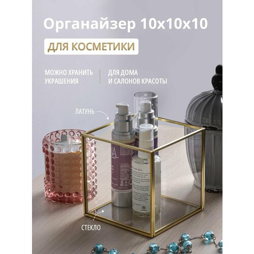 Размер 10х10х10см. Современная деталь интерьера. Органайзер для косметики изготовлен из стекла и латуни. Ручная сборка.