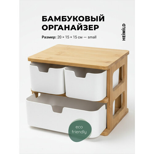 Бокс для хранения BORG от HEIMILD — сочетает в себе эргономичный дизайн и экологичность. Органайзер сделан из натурального бамбука, поэтому он гармонично дополнит любой современный интерьер и будет радовать вас красотой и удобством. Три вместительных выдвижных лотка из биоразлагаемого пластика создадут дополнительное место для хранения различных аксессуаров: косметики, флаконов, кремов, маникюрных и гигиенических принадлежностей, резинок для волос и множества разных мелочей. Большой органайзер для косметики найдет свое применение в ванной возле раковины, в качестве небольшой полки для ванной комнаты или на туалетном столике. Идеальный помощник разместит в себе всё, что необходимо иметь под рукой.