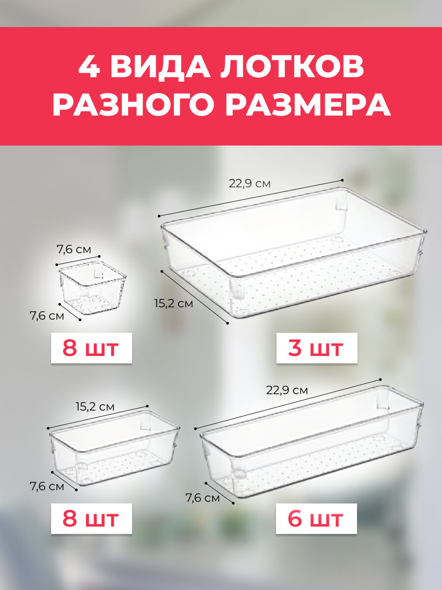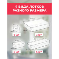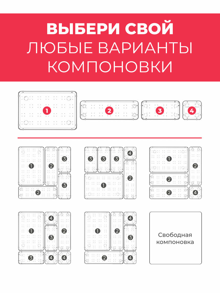 Комплект состоит из прозрачных лотков, которые можно разделить и использовать в нескольких местах. Это позволяет экономить пространство и эффективно использовать