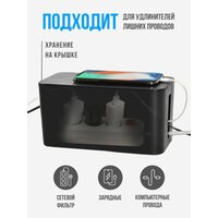 Изготовлен из прочного пластика, имеет нескользящее дно и обтекаемую форму. Вы сможете подобрать модель органайзера в нужном для Вас размере и цвете. Держатель для проводов обеспечит полезную площадь вместо беспорядка. На верхней крышке коробки образуется дополнительное место, которое можно использовать, как подставку для хранения необходимых вещей. Пластиковый бокс с крышкой создаст порядок: