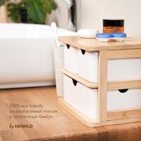 Бокс для хранения BORG от HEIMILD — сочетает в себе эргономичный дизайн и экологичность. Органайзер сделан из натурального бамбука, поэтому он гармонично дополнит любой современный интерьер и будет радовать вас красотой и удобством. Три вместительных выдвижных лотка из биоразлагаемого пластика создадут дополнительное место для хранения различных аксессуаров: косметики, флаконов, кремов, маникюрных и гигиенических принадлежностей, резинок для волос и множества разных мелочей. Большой органайзер для косметики найдет свое применение в ванной возле раковины, в качестве небольшой полки для ванной комнаты или на туалетном столике. Идеальный помощник разместит в себе всё, что необходимо иметь под рукой.