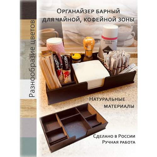 Органайзер барный деревянный Ivkolab c 8 секциями организует упорядоченное хранения кофе, чая, салфеток и специй дома на кухне, в офисе, в баре, ресторане. Незаменимый атрибут на кофе-брейк. Дизайн органайзера лаконично впишется в любой современный интерьер кафе, ресторана, бара, столовой, автозаправки АЗС и пекарни, а так же фаст-фуда. Диспенсер на бар подойдет для размещения в барной зоне везде, где продают кофе с собой навынос. В стильной коробке для кофе паузы на барной стойке можно разместить не только аксессуары для кофе машин, но и бумажные салфетки, одноразовые стаканчики с крышками, ложечки и палочки, размешивали и коктейльные трубочки.