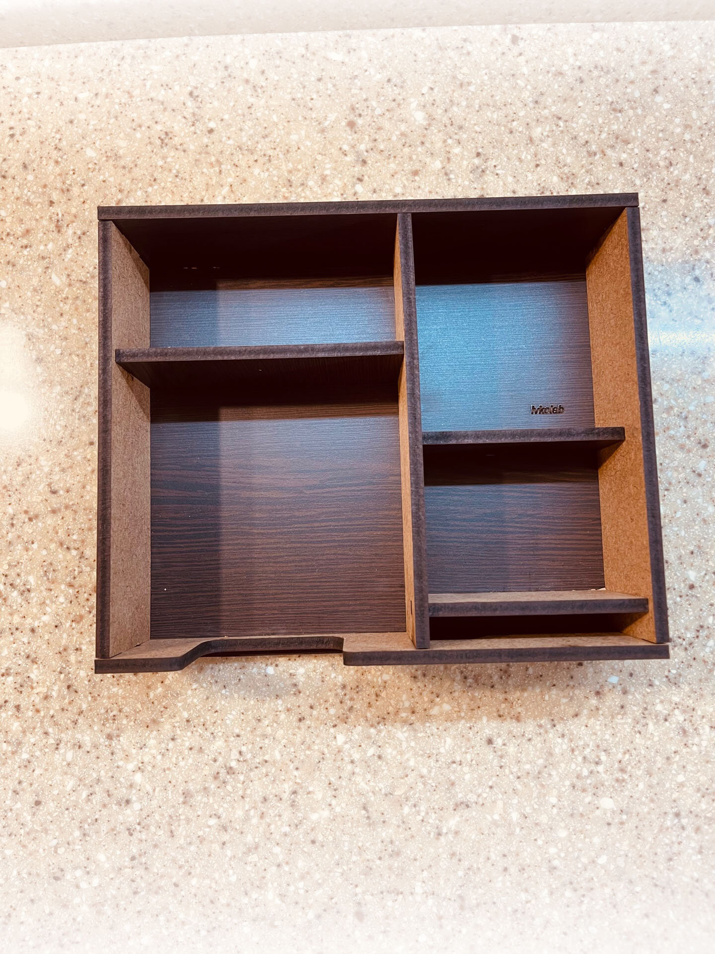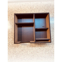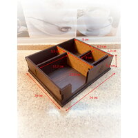 Органайзер выполнен из качественного ЛДСП, что обеспечивает его долговечность и устойчивость к повреждениям. Коричневый цвет органайзера подойдет к любому интерьеру и будет гармонично смотреться на барной стойке или на кухонном столе.