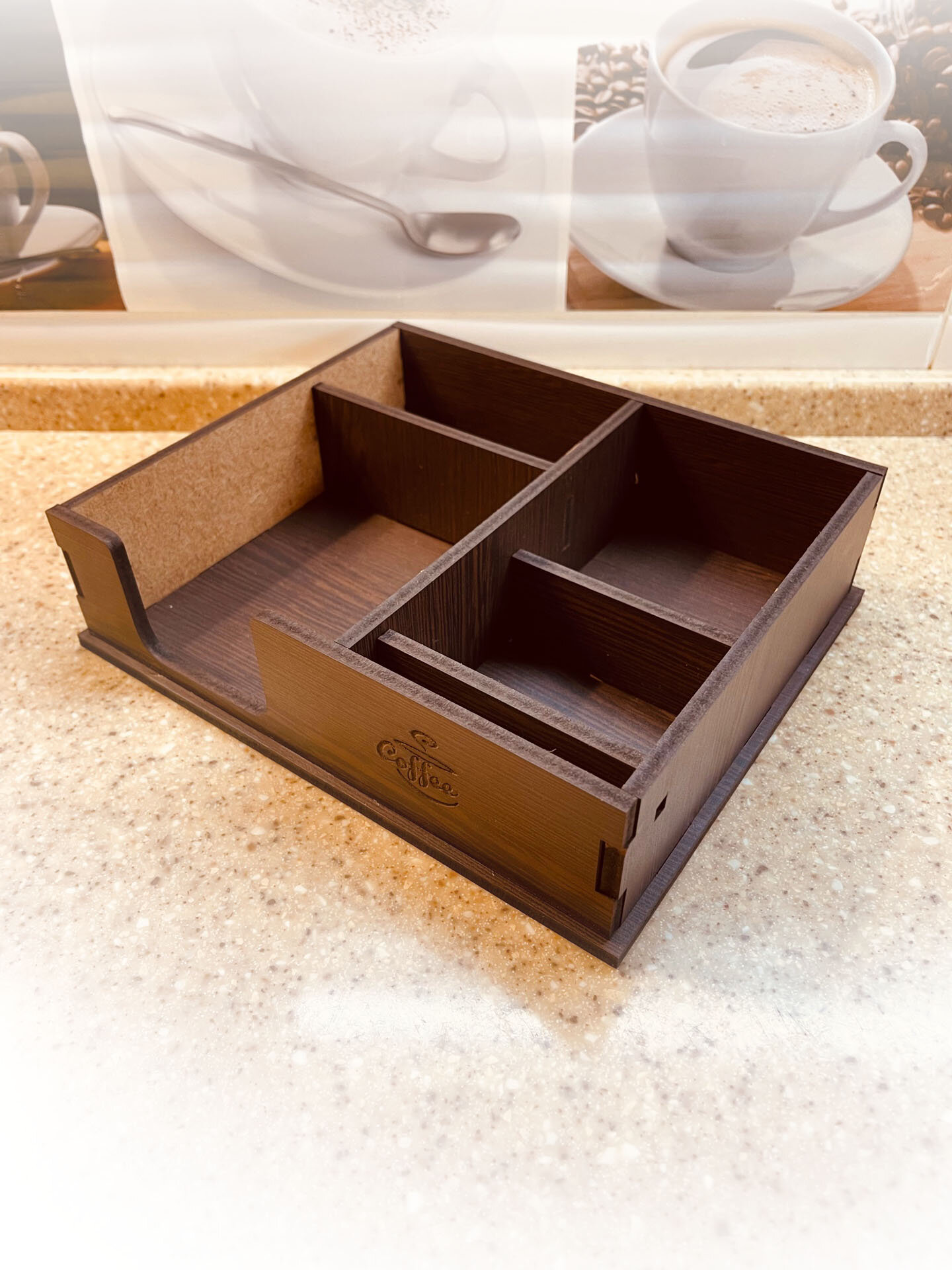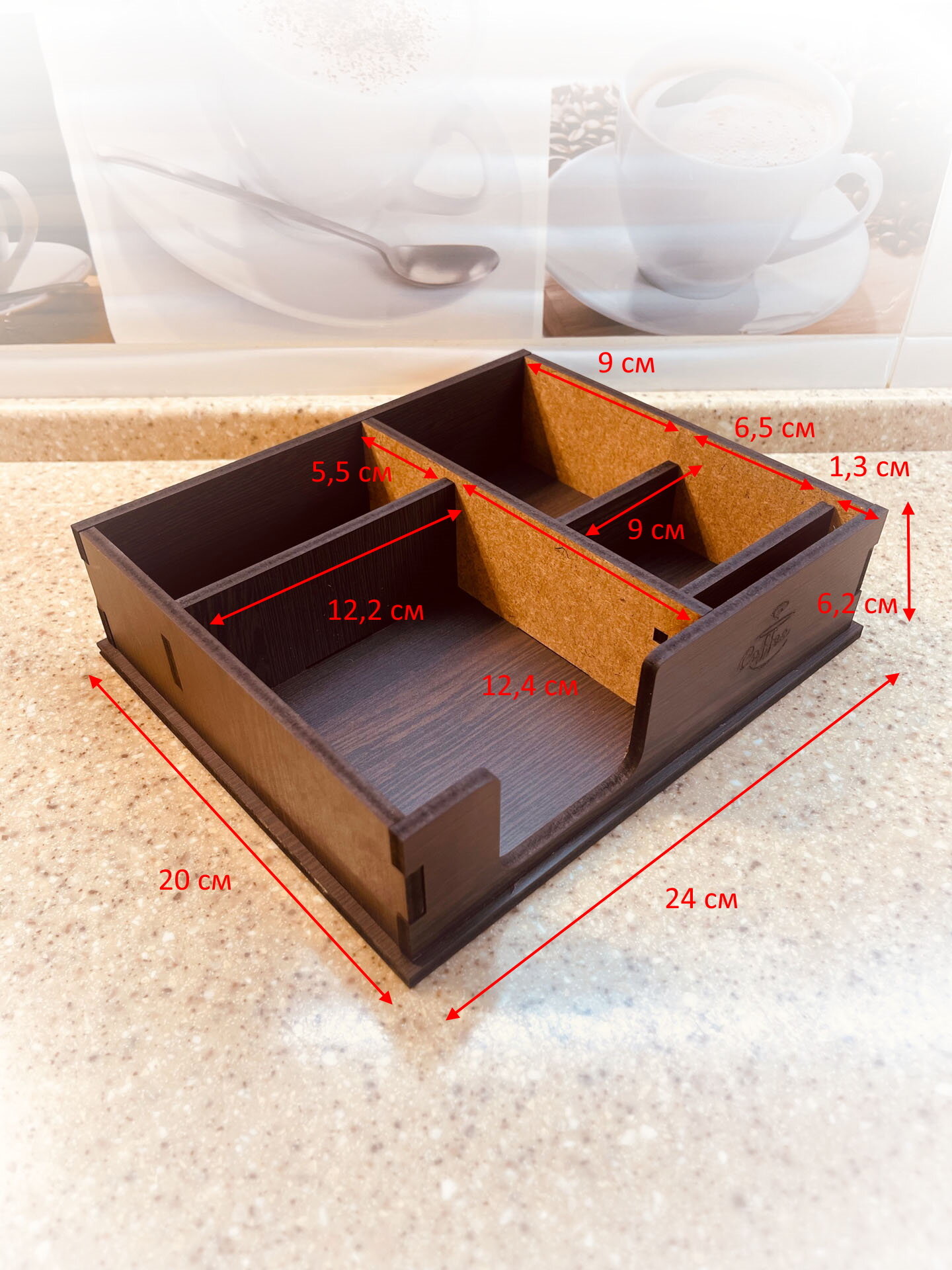 Органайзер имеет пять секций, что позволяет удобно хранить кофе, чай, салфетки и специи. Это делает его незаменимым атрибутом на кофе-брейках и других мероприятиях, где требуется упорядоченное хранение напитков и аксессуаров.