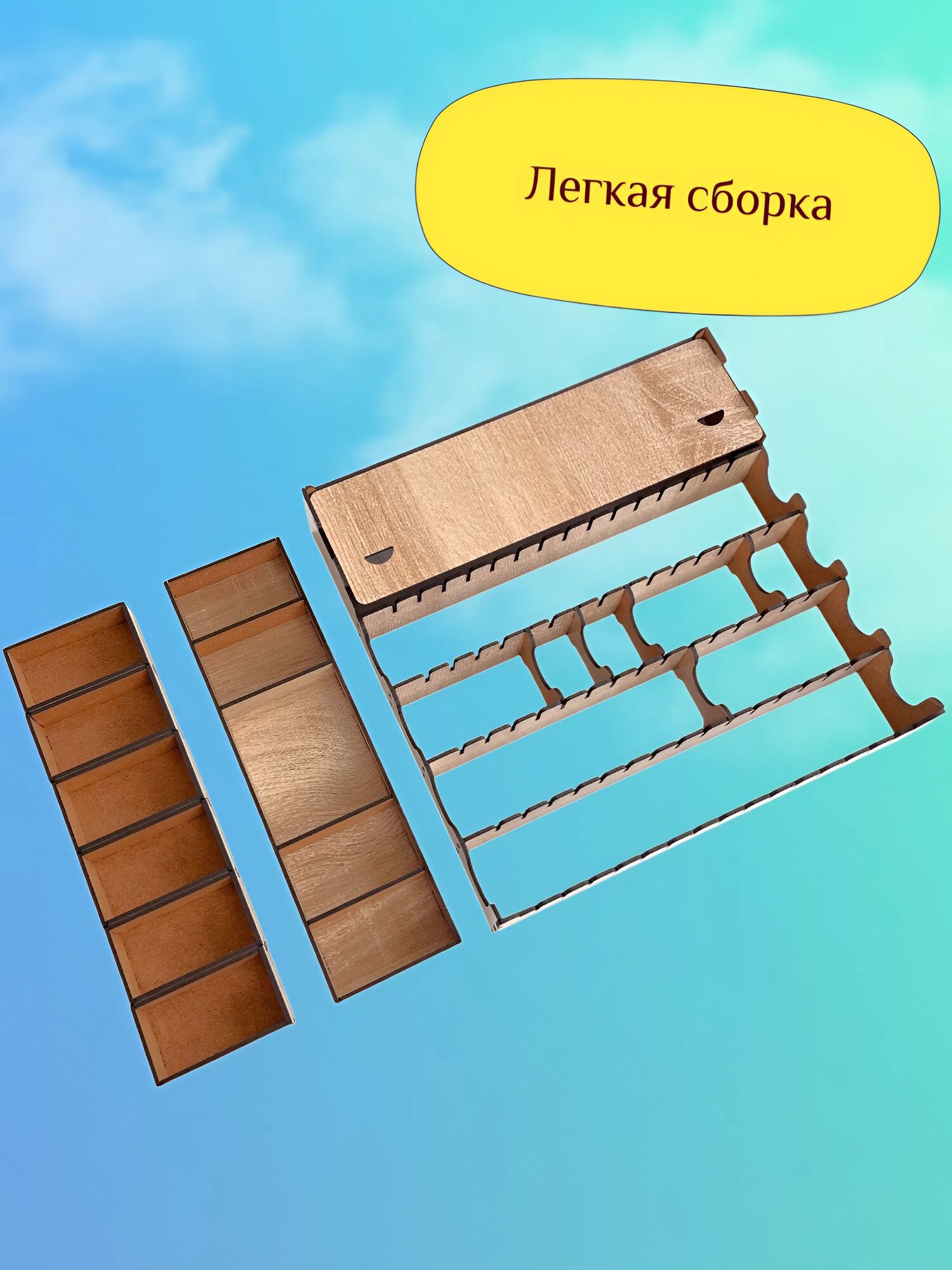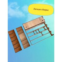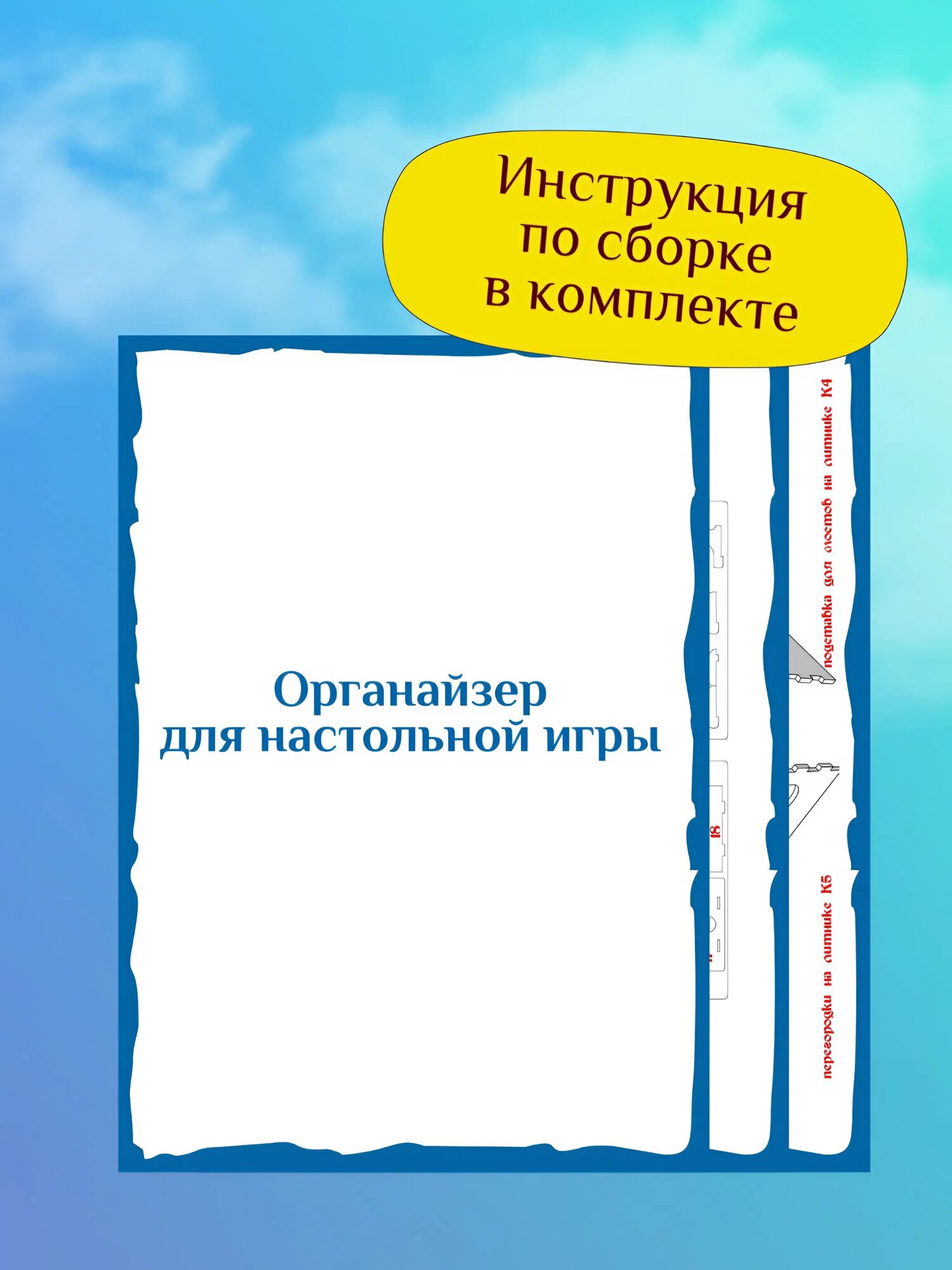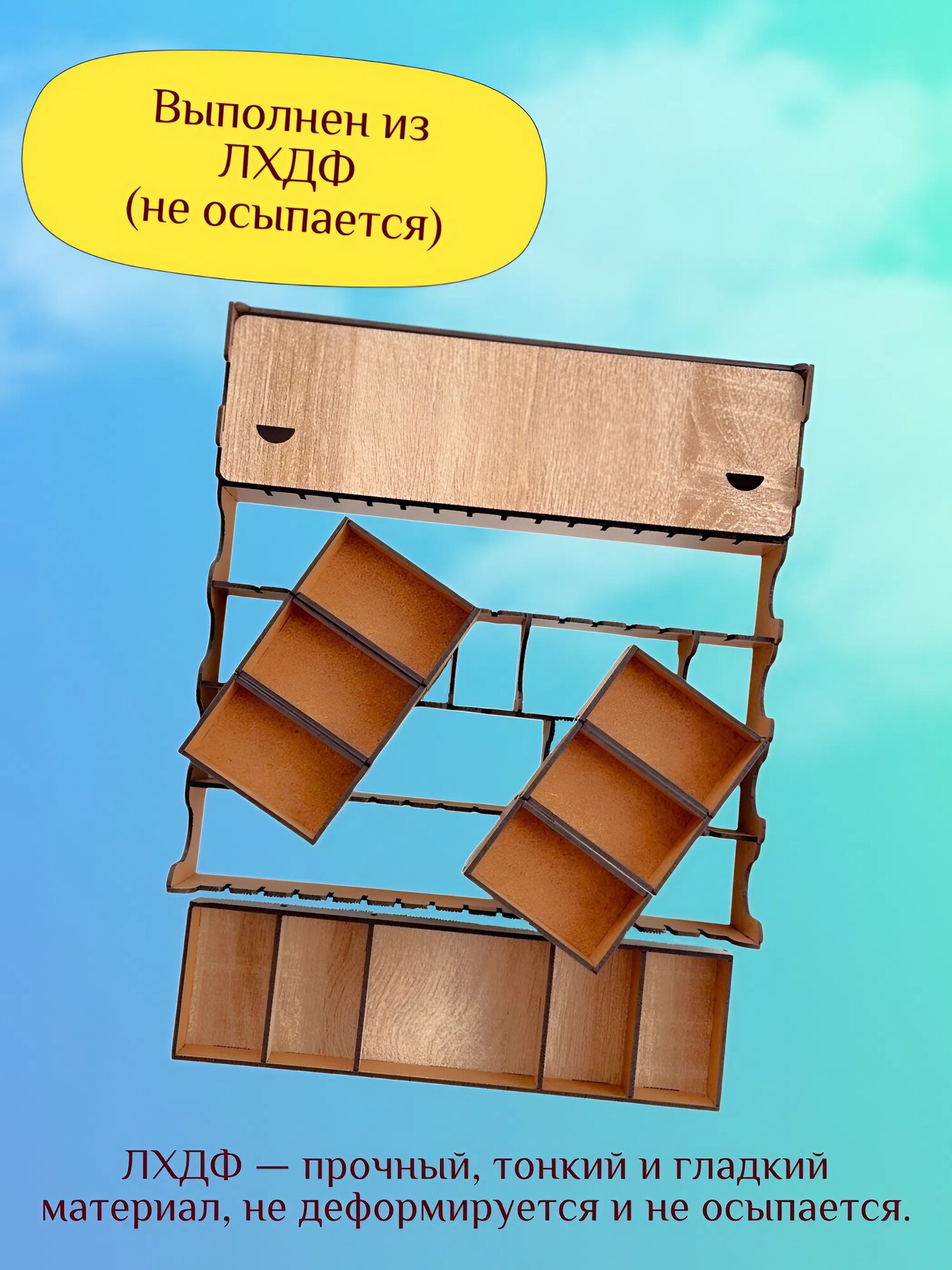 Органайзер, изготовленный из лхдф - это прочный, тонкий и гладкий материал, не деформируется и самое главное не осыпается, легко собирается (инструкция в комплекте). Он помогает быстро начать игру, так как все элементы рассортированы по своим местам. Поставляется в разобранном виде и надежной упаковке.
