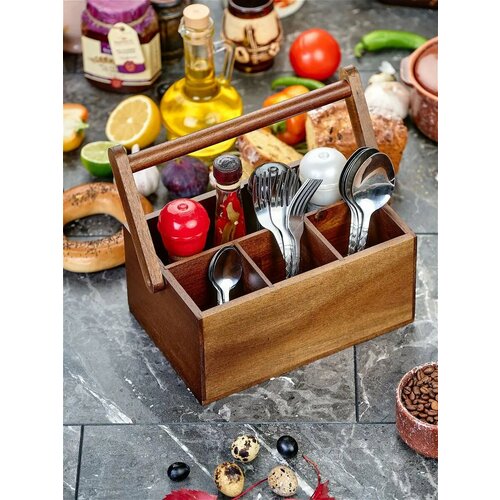 Органайзер, выполненный из экологичной и прочной древесины акации, станет украшением для Вашей кухни и поможет организовать пространство. Простой и лаконичный дизайн впишется в любой интерьер, а текстура дерева придаст уюта. Идеальное решение для хранения различных соусов, столовых приборов, и других кухонных принадлежностей. Акация обладает высокой твердостью, водоотталкивающей поверхностью и не впитывает запахи, благодаря чему изделие прослужит долго, сохраняя свои эстетические качества. Размер 27*16,5*11,5 см.