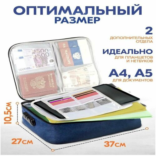 Органайзер для хранения документов - отличный способ держать документы в порядке, в одном месте и нужная вещь в путешествиях, используя его, вы легко создадите полноценную систему хранения вещей и документов. Преимущества органайзера для документов и вещей: сумку для документов удобно брать с собой в командировки и путешествия, защита личных вещей блокировкой паролем (заводской пароль - 3 ноля (000)), качественный износостойкий материал, второе отделение папки и бумаги формата А4, папка для хранения документов имеет специальный ремень для крепления на ручки чемодана. Теперь все документы в одном месте: паспорта, дипломы, налоговые, медицинские и другие документы будут удобно разложены в органайзере и вам не придется долго искать важную бумагу. Размеры кофра 37х28х10 см. Кейс удобно брать с собой в командировки. Имеется ручка для переноса папки и ремень для крепления на выдвижную ручку чемодана. Органайзер в автомобиль вмещает формат бумаги А4. Кейс для хранения вещей имеет одно основное отделение с застежкой, отдельную папку файл-вкладыш для документов с файлами. Также на крышке портфеля предусмотрено 4 отсека для паспортов и мелких аксессуаров. Материал органайзера для хранения канцелярии водостойкий. Поэтому можете не переживать, если попадете под дождь. Модель сумки подойдет не только для хранения документов, в нем удобно разместить и рукоделие, и детские принадлежности для творчества, и гаджеты, и аксессуары для автомобиля.