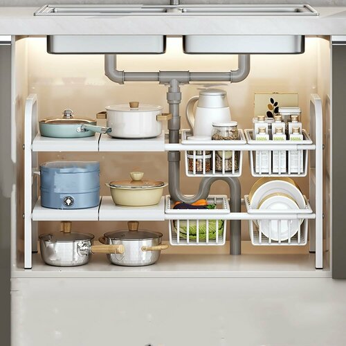 Полка для хранения под раковиной — расширяемая полка является идеальным решением для шкафов с сантехникой. Он растягивается по длине, регулируется по высоте, а полка является съемной, что позволяет хранить его, не касаясь сливной трубы, максимально используя пространство.