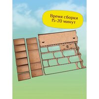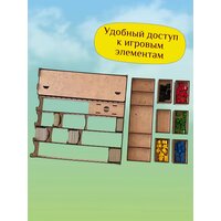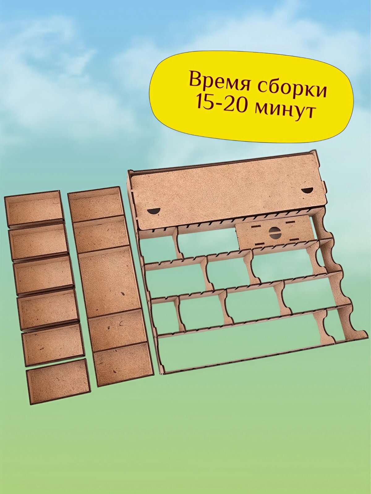 Органайзер, изготовленный из ХДФ, легко собирается (инструкция в комплекте). Он помогает быстро начать игру, так как все элементы рассортированы по своим местам. Поставляется в разобранном виде и надежной упаковке.
