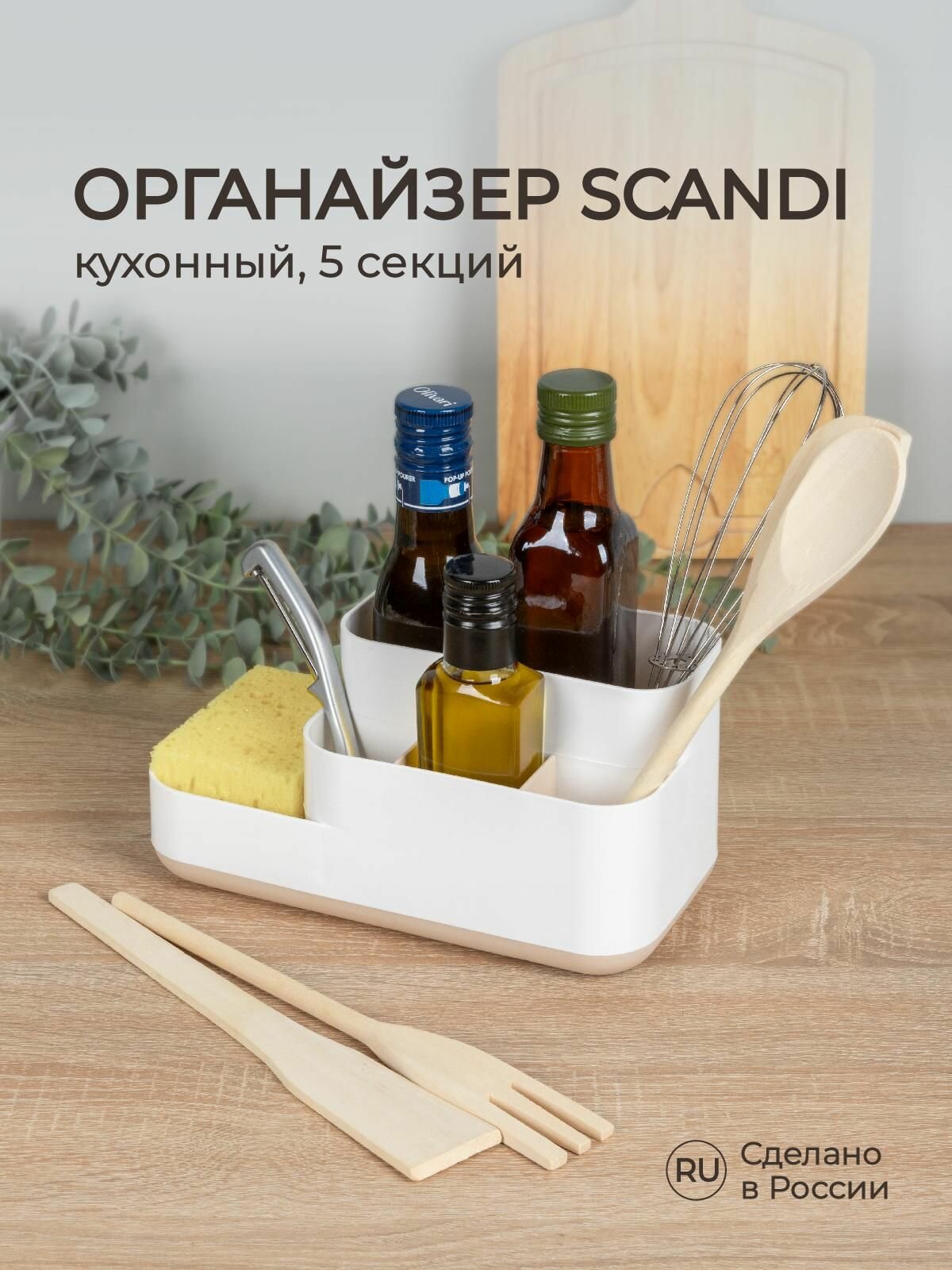 Органайзер кухонный поможет поддержать порядок на кухне. Секции разной высоты и ширины позволяют разместить в органайзере бутылочки с соусами или различные кухонные аксессуары, храня их под рукой. Благодаря минималистичному элегантному дизайну в сдержанной цветовой гамме, органайзер дополнит любой кухонный интерьер. Подходит для использования в комнатах с повышенной влажностью, легко моется в посудомоечной машине. Изготавливается из 100% перерабатываемого безопасного полипропилена. Вид: для специй. Длина: 230 мм. Ширина: 118 мм. Высота: 113 мм. Форма: прямоугольная. Материал: полипропилен. Количество секций: 5 шт. Цвет: бежевый. Вес нетто: 0.202 кг. Вращающийся: нет. С ложками в комплекте: нет. Габариты без упаковки: 230x118x113 мм. Комплектация: органайзер кухонный - 1 шт, Упаковка.
