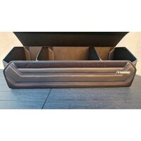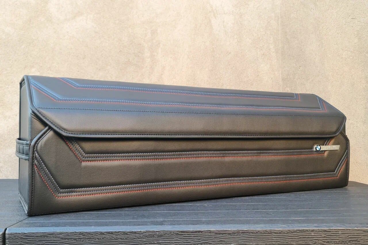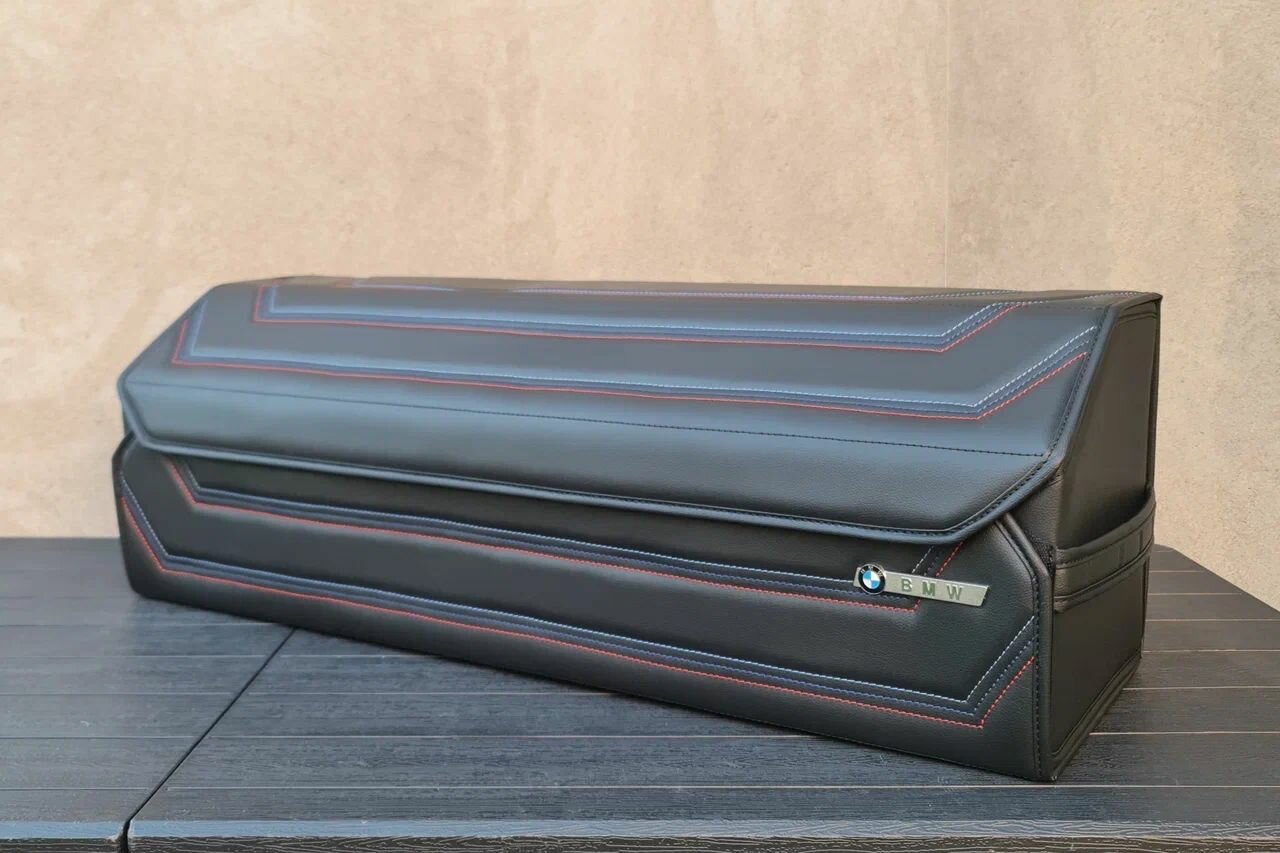 Наша сумка в багажник автомобиля выполнена из премиальной экокожи черного цветa, стилизована тройной строчкой BMW M Power и шильдиком BMW. Что придает органайзеру особую изысканность. Он идеально подходит для хранения инструментов. Прочный каркас из композитного кожкартона делает органайзер стойким к различным химическим веществам, таким как моторное масло, незамерзайка, что позволяет использовать его в любых условиях без опасений за его состояние. Ящик в багажник легко очищается, не впитывает влагу и обладает износостойким внутренним слоем из файбертекса, что гарантирует долговечность эксплуатации. Сборка органайзера автомобильного занимает всего несколько минут, а липучки на дне и задней стенке обеспечивают надежное крепление.