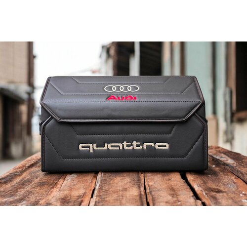 Наша сумка в багажник автомобиля выполнена из премиальной экокожи коричневого цветa cтилизовaнная вышивкой эмблемы и нaимeнoвaниeм марки AUDI. Она идеально подходит для хранения инструментов. Прочный каркас из композитного кожкартона делает органайзер стойким к различным химическим веществам, таким как моторное масло, незамерзайка, что позволяет использовать его в любых условиях без опасений за его состояние. Он легко очищается, не впитывает влагу и обладает износостойким внутренним слоем из файбертекса, что гарантирует долговечность эксплуатации. Сборка органайзера автомобильного занимает всего несколько минут, а липучки на дне и задней стенке обеспечивают надежное крепление.