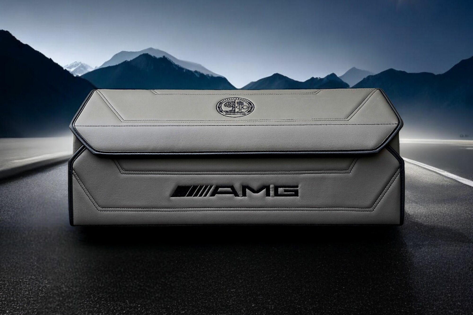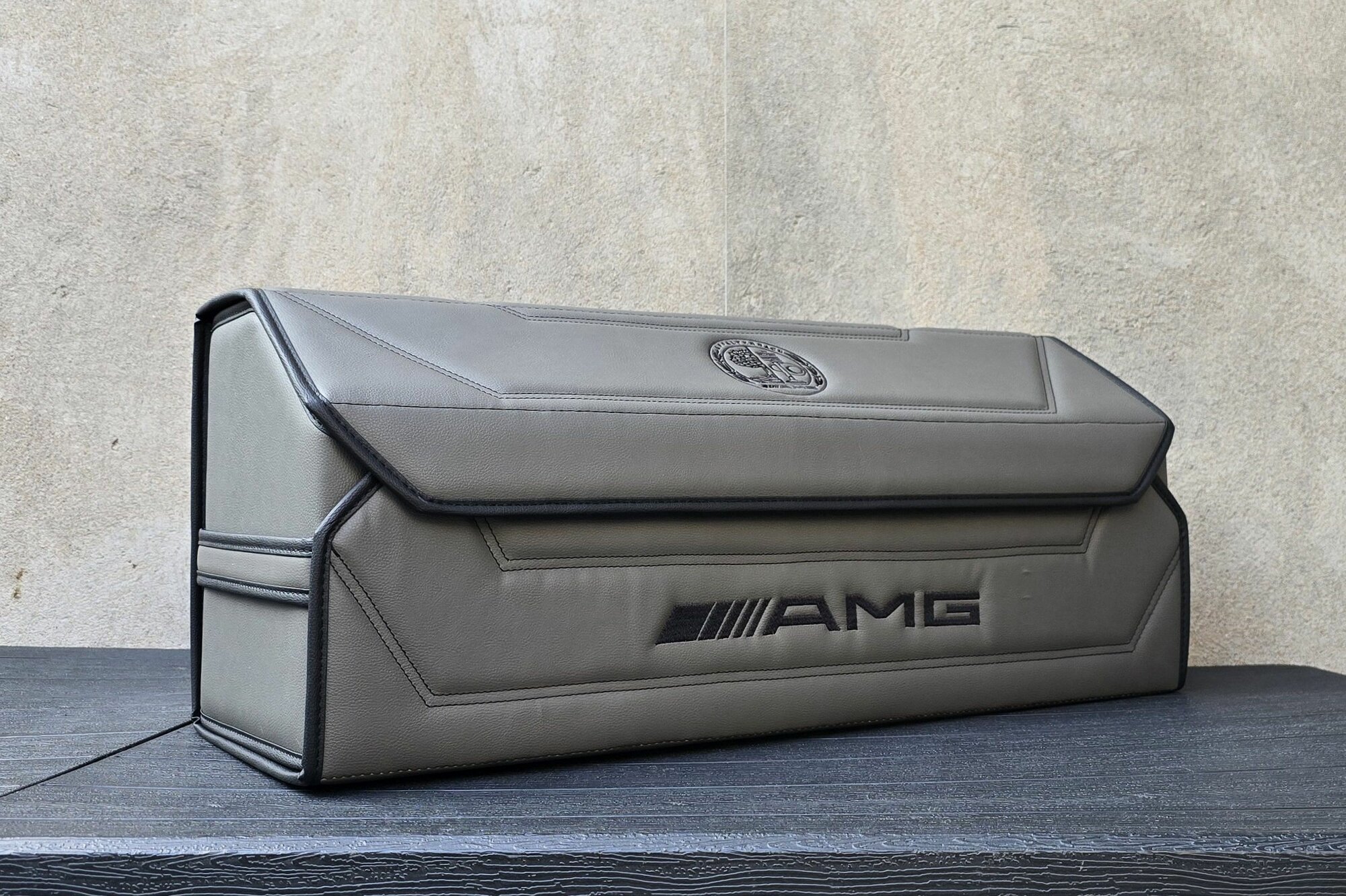 Наша сумка в багажник автомобиля выполнена из премиальной экокожи серого цвета, стилизована вышивкой эмблемы Mercedes-Benz и фирменной надписью ///AMG. Это придает органайзеру особую изысканность. Он идеально подходит для хранения инструментов. Прочный каркас из композитного кожкартона делает органайзер стойким к различным химическим веществам, таким как моторное масло, незамерзайка, что позволяет использовать его в любых условиях без опасений за его состояние. Ящик в багажник легко очищается, не впитывает влагу и обладает износостойким внутренним слоем из файбертекса, что гарантирует долговечность эксплуатации. Сборка органайзера автомобильного занимает всего несколько минут, а липучки на дне и задней стенке обеспечивают надежное крепление.