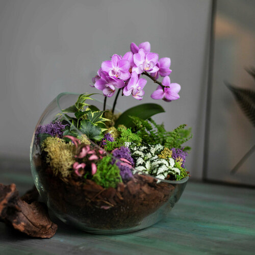 Флорариум с мини орхидеей с 2-мя или 3-мя цветоносамм, в элегантной стеклянной вазе. В дополнение различные тропические растения. Диаметр 23 см. Декор: натуральные коряги и камни, стабилизированный мох.