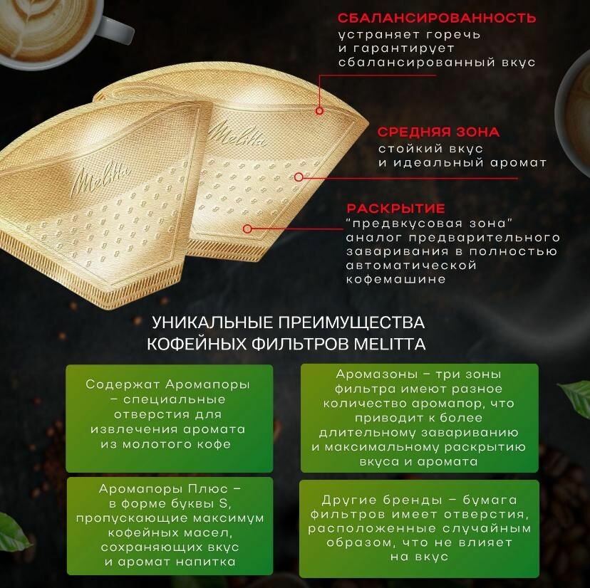 Испытайте наслаждение насыщенным и сбалансированным вкусом с кофейными фильтрами Melitta Original. 3 запатентованные ароматны со специальными аромапорами гарантируют превосходное раскрытие вкуса и аромата вашего кофе.