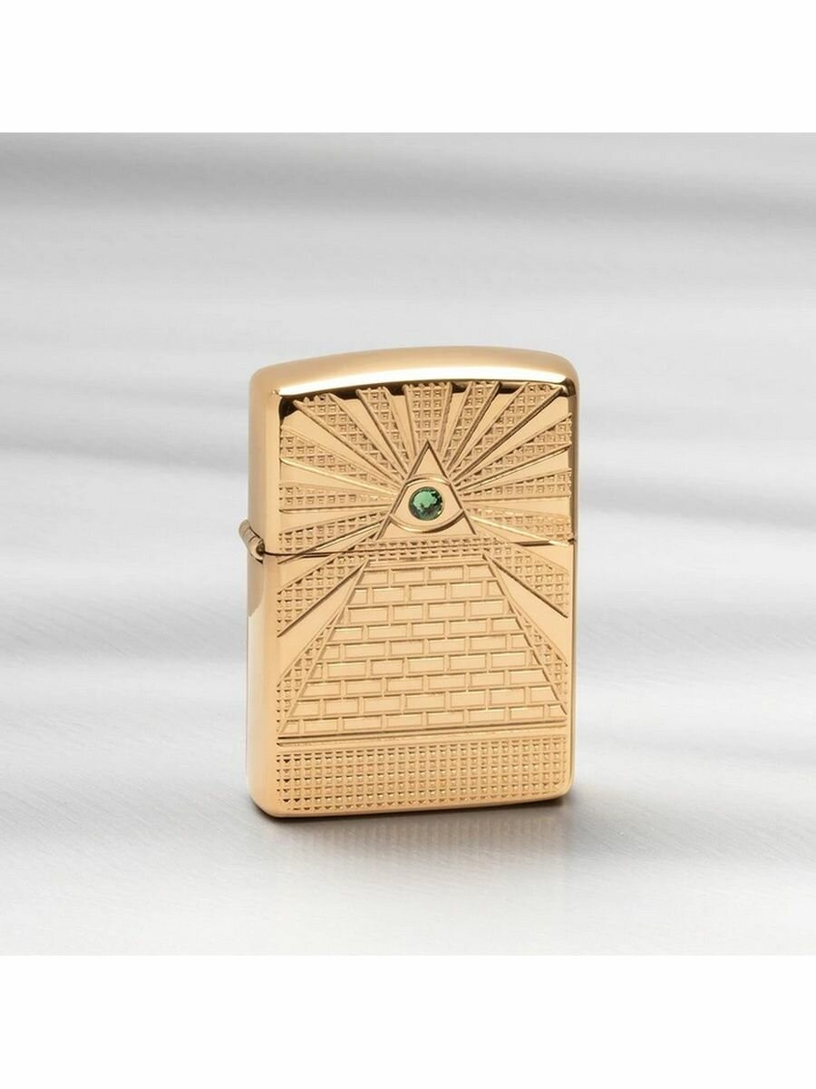 Zippo представляет вашему вниманию ещё одну модель с изображением Всевидящего ока, на которой Божий взор проистекает из зеленого кристалла Swarovski®, посаженного на вершину пирамиды с глубоким резным оттиском.