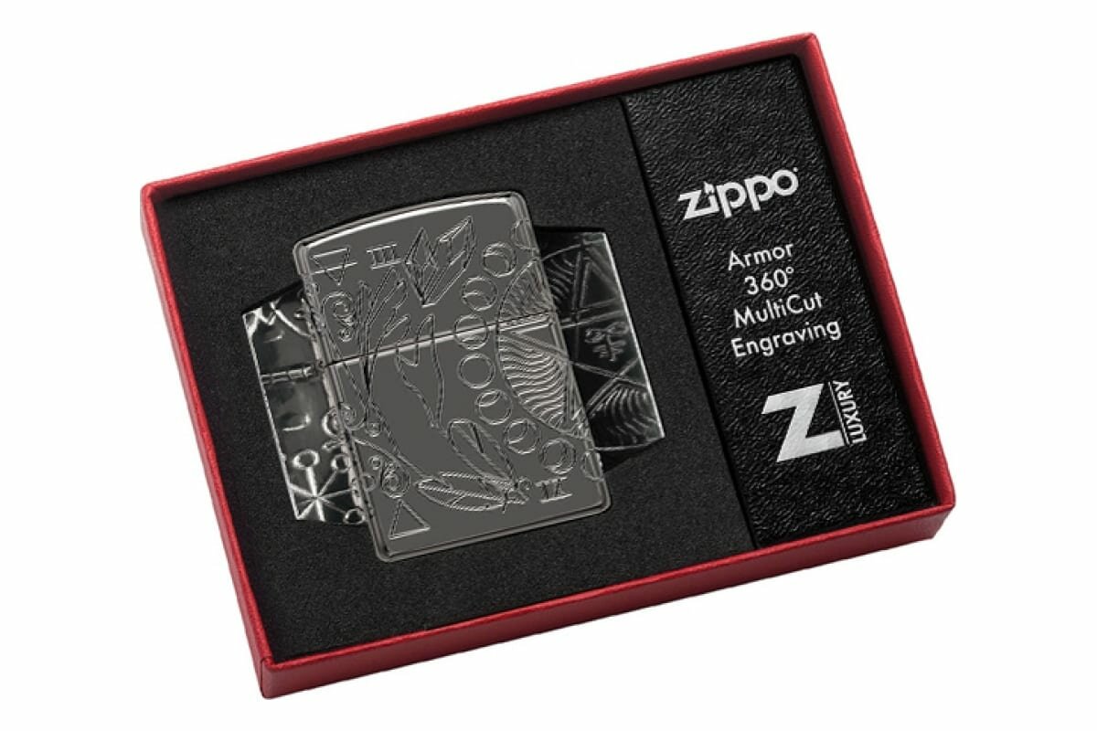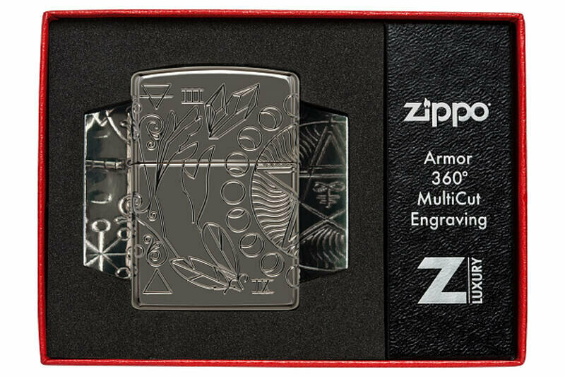 Ветроустойчивая многоразовая зажигалка ZIPPO Armor™ 49689 — Викка с покрытием Black Ice® имеет красивое черное покрытие, которое меняет цвет в зависимости от освещения, с одной стороны оно черное глянцевое, а с другой стороны оно переливается и становится зеркальным. На всей поверхности зажигалки ZIPPO с помощью технологии многогранной гравировки нанесены оккультные знаки навеянные черной магией. Покрытие Black Ice® - «чёрный лёд» получается благодаря PVD-технологии, это специальный метод обработки поверхности металла, в вакуумной среде и при высоких температурах, путем воздействия на него молекул других металлов. Зажигалка ZIPPO изготавливается из латуни, сначала она никелируется, потом хромируется и только затем на нее наносится PVD-покрытие. Такой метод обработки поверхности, придает зажигалке ZIPPO не только оригинальный цвет, но и прибавляет устойчивости к царапинам, ударам и механическим воздействиям.