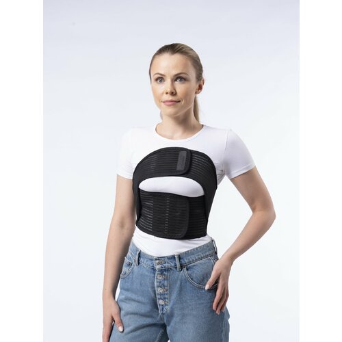 Особенности: • минимизирует давление на область молочной железы при сохранении необходимой степени фиксации грудной клетки благодаря особой форме основы; • обеспечивает необходимую степень фиксации для уменьшения болевого синдрома при лечении патологии грудной клетки за счет эластичности основы; • исключает негативное воздействие на мускулатуру выдоха, т. к. нижний край изделия не оказывает давления на мышцы живота, что является пассивной профилактикой «застойных явлений» в легких; • имеет малый вес и обеспечивает естественную вентиляцию при сохранении необходимой степени фиксации за счет особой структуры материала; • обеспечивает равномерность фиксации по всей поверхности грудной клетки за счет дискретной конструкции застежки.