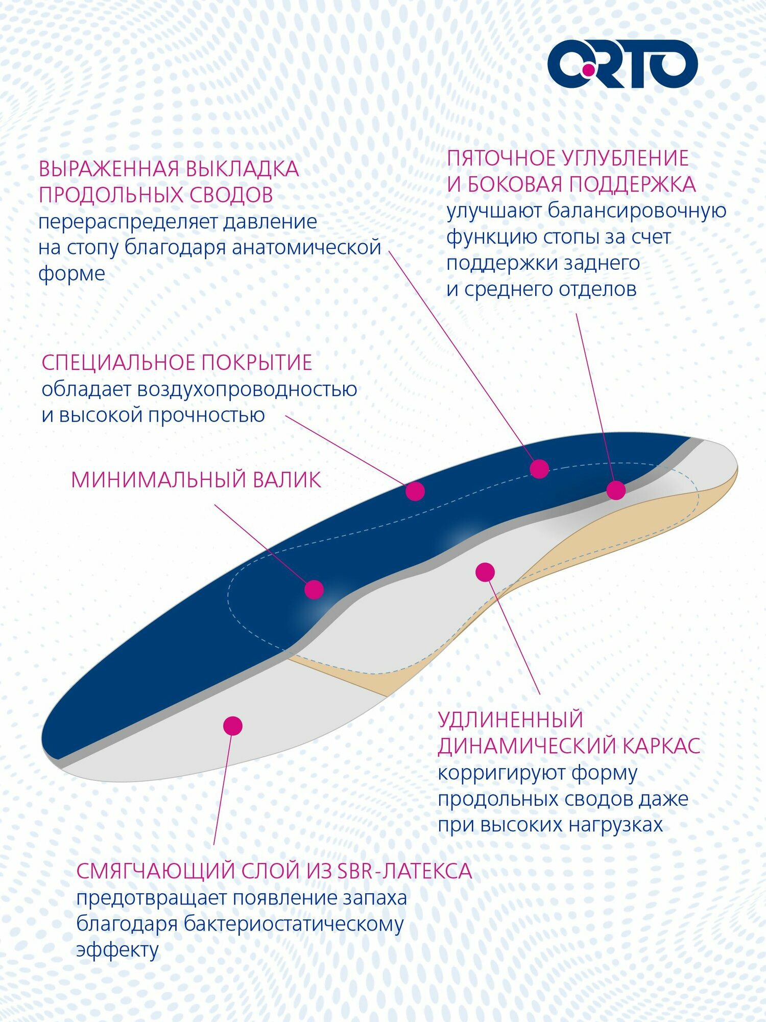 | Дополнительная информация | Ортопедические стельки с динамическим каркасом, продленным до уровня головок плюсневых костей. Характеризуются выраженной выкладкой продольных сводов и минимальным метатарзальным валиком. Имеют смягчающий слой из SBR-латекса, выраженную боковую поддержку и чашеобразное углубление под пятку. Передняя часть стельки заужена. Покрытие изготовлено из износостойкого материала. |