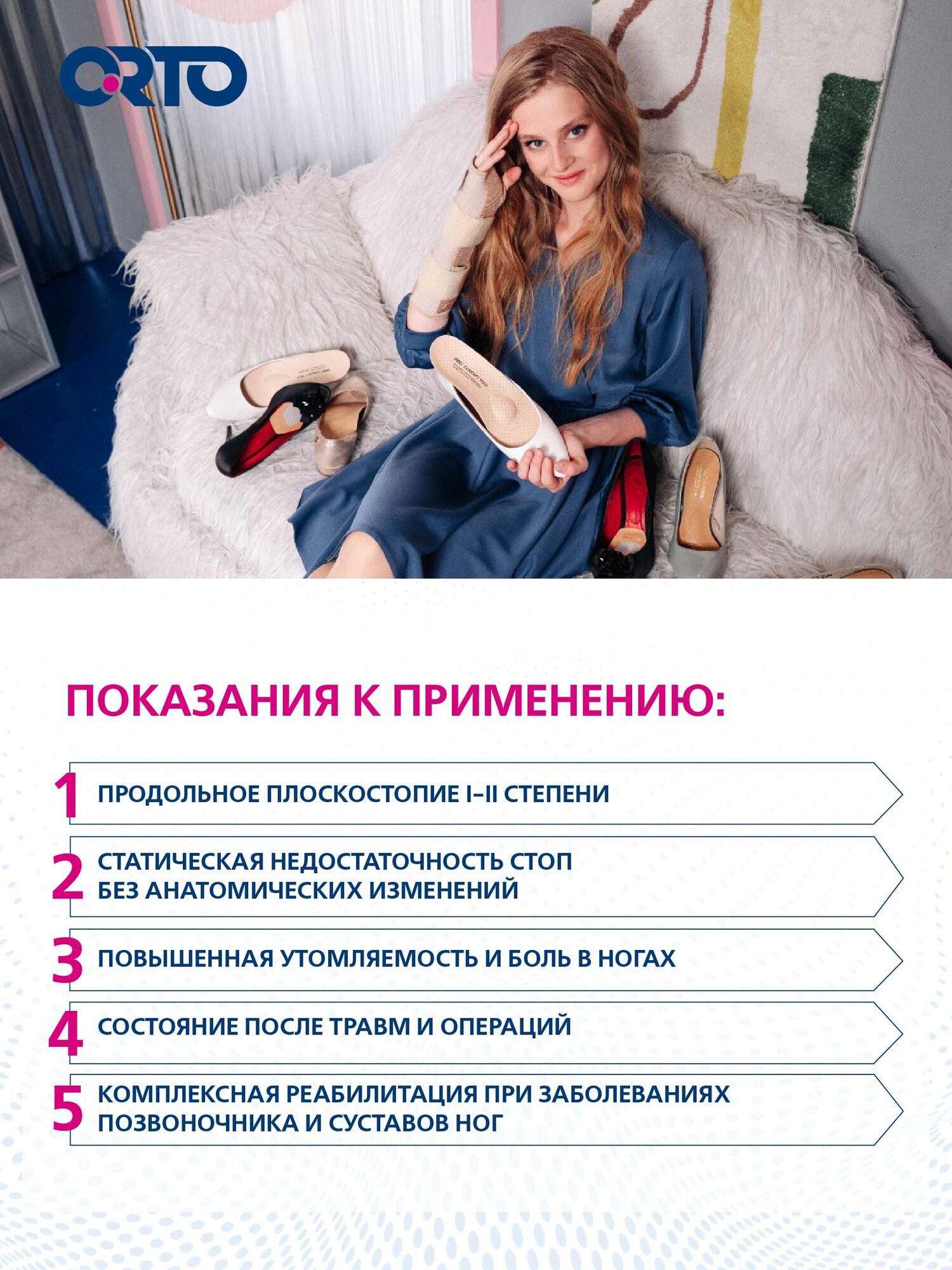 | Показания | артрит/артроз, беременность, вальгусная деформация, варусная деформация, деформация нижних конечностей, дисплазия соединительной ткани, искривление позвоночника, лишний вес, натоптыши, повышенная нагрузка на ноги, полая стопа, поперечное плоскостопие, продольно-поперечное плоскостопие, продольное плоскостопие, пяточная шпора |