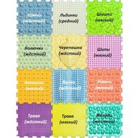 Данный набор состоит из 12 модульных ковриков. Сочетание разнопрофильных и разножёстких модулей позволяет проводить упражнения на них с максимальной пользой. Богатая цветовая палитра ковриков поможет ребёнку в изучении разнообразия цветов. Модульное строение позволяет по желанию варьировать размер и форму готового изделия. Вы с легкостью можете разобрать коврик и сложить из него тропинку, по которой малыш с удовольствием будет ходить. Плитки не займут много места в шкафу, комоде или ящике. Между собой модули крепятся по принципу детского конструктора «пазл».