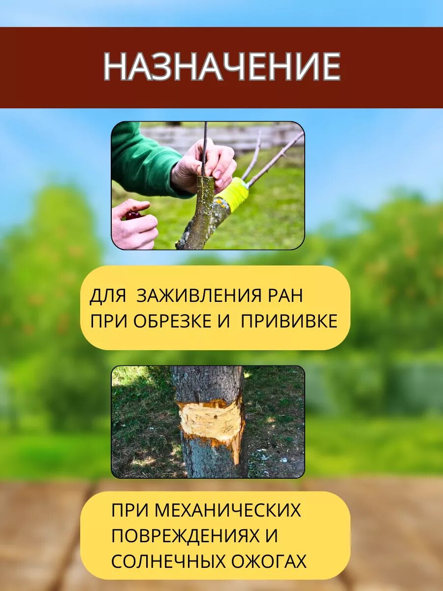 для заживления ран при обрезке и прививке, механических повреждениях и солнечных ожогах плодовых и декоративных деревьев, кустарников и виноградной лозы.