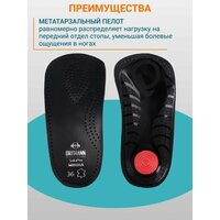 - метатарзальный пелот равномерно распределяет нагрузку на передний отдел стопы, уменьшая болевые ощущения в ногах;
