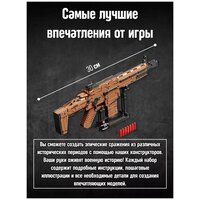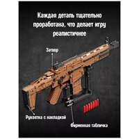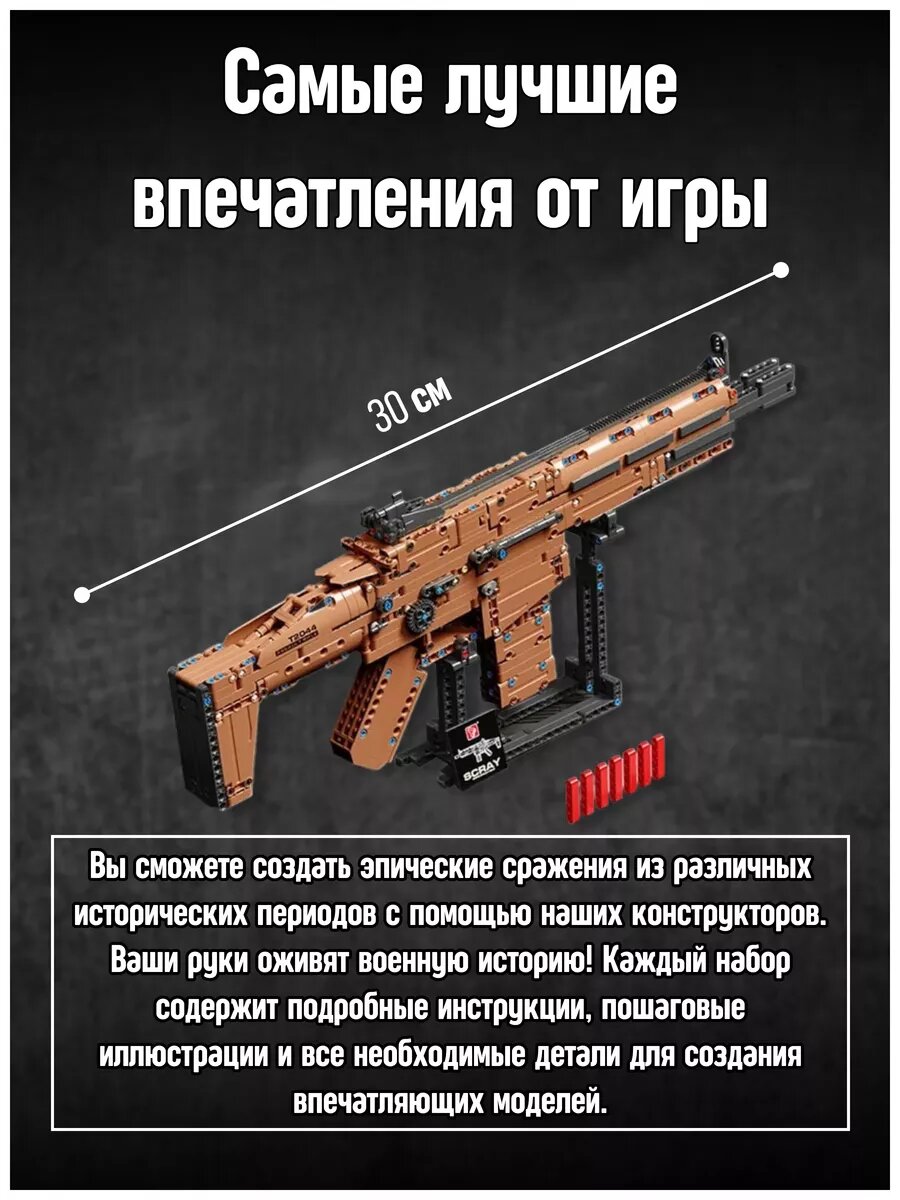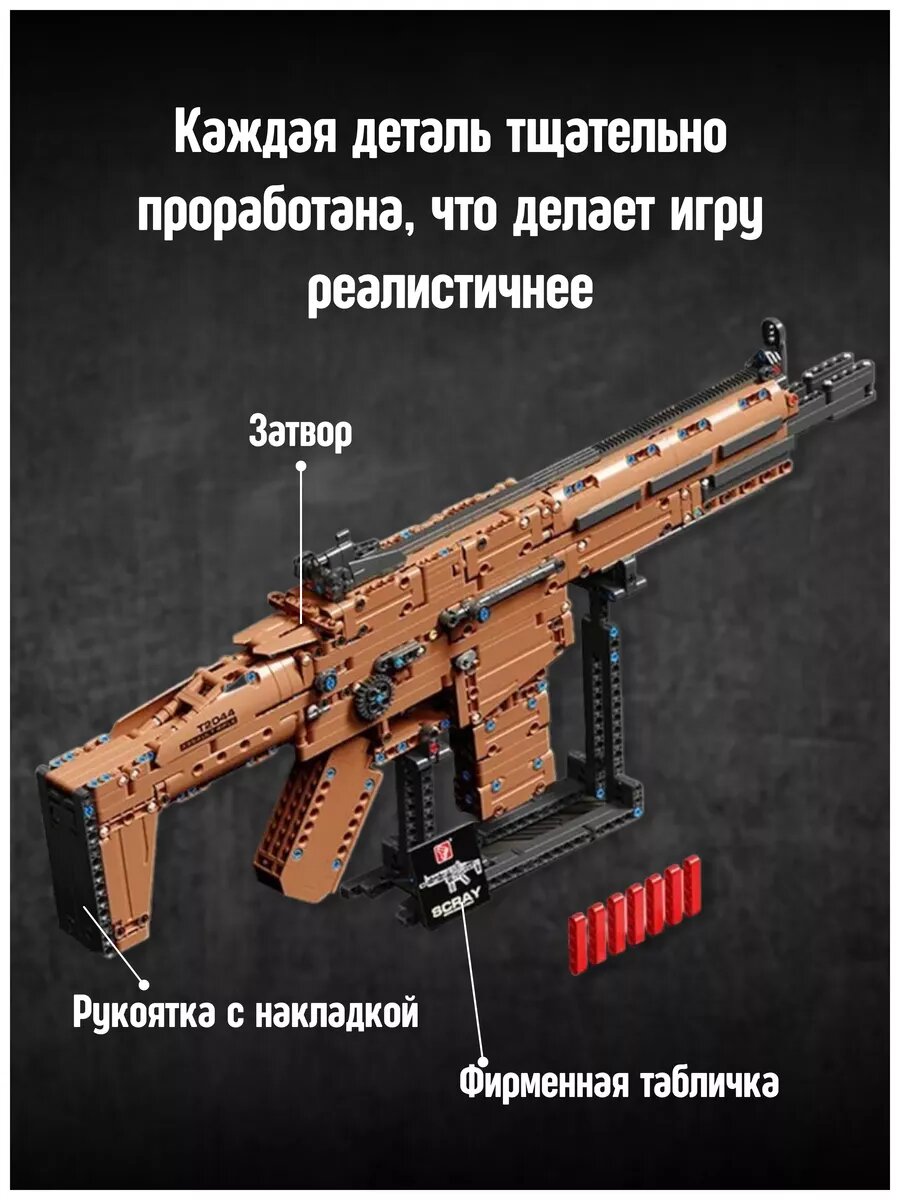 Конструктор Штурмовая винтовка SCAR 1090 деталей. Являются моделями популярных оружий из знаменитых игр, любимых среди детей: CS: GO, Call of Duty, PUBG, Battlefield, standoff, стендофф 2. Вы и ваш ребенок здорово проведете время, собирая этот конструктор. Помимо развлекательной функции он способствует развитию творческого мышления и тренирует мелкую моторику пальцев. Помогает детям осваивать окружающую действительность посредством веселого развлечения. Детские психологи считают, что с помощью такой игрушечки ребенок 7-8-9-10 лет прививает у себя самостоятельность, усидчивость и внимательность. Кроме этого, он учится конструировать и воплощать в жизнь придуманные модели и образы. Серия конструкторов Technical оружие одна из немногих, которая не представлена в оригинале. В линейке можно найти детское оружие с мягкими пульками, конструкторы-автоматы, классические снайперские винтовки с пулями, штурмовые винтовки, пистолеты и много разнообразного игрушечного оружия. Сборка такого конструктора будет крайне увлекательной и необычной, даже для искушенного любителя конструкторов, а понимание механизмов оружия поспособствует развитию важных навыков у ребенка. Стрельба из оружия осуществляется в основном за счет натяжения резинок или пружин. Приобретая конструкторы оружие, не переживайте о безопасности, ведь они обладают недостаточной для нанесения травм дульной энергией, либо стреляют мягкими патронами. Такое занятие позволяет развивать необходимые для каждого навыки. Кроме того, большой конструктор еще и полезная игрушка, потому что требует от малыша внимания, сосредоточенности и аккуратности. Аналоги совсем не отличаются от оригинала датской фирмы. Благодаря понятной инструкции в голове вашего сына будет сформирована картина конечного результата действия. Новинка будет прекрасным подарком для всех возрастов как мальчику-подростку так и девочке как новогодний презент, а также на День Рождения, 8 Марта или просто без повода.