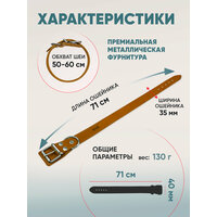 Кожаный ошейник для собак выполнен из натуральной кожи с использованием фурнитуры повышенной прочности. Вставка из кожи препятствует попаданию шерсти во время застегивания, она не будет натирать, сковывать движения питомца, ношение будет комфортным. Полукольцо кольцо для крепления поводка и украшения (адресника). Дополнительное укрепление полукольца заклепкой обеспечивает высокую разрывную нагрузку изделия. Ошейник для собак из кожи - стильный прочный аксессуар. Ошейник для собак представлен в нескольких размерах, обратите внимание на название товара - в нем указан обхват шеи питомца. Анатомические ошейники для собак продуманы и созданы вручную из кожи Российского производства. Нейлоновые нити повышенной прочности в цвет изделия - классический стиль, подтвержденный временем. Ошейник упакован в подарочную упаковку - прочный пластиковый мешочек, который можно использовать для хранения мелочей в доме. Размеры: Обхват шеи регулируется от 50 до 60 см. Ширина ошейника 35 мм. Вес ошейника 130 грамм. Состав: натуральная кожа, металл, нить нейлоновая. пряжка никель