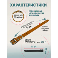 Кожаный ошейник для собак выполнен из натуральной кожи с использованием фурнитуры повышенной прочности. Вставка из кожи препятствует попаданию шерсти во время застегивания, она не будет натирать, сковывать движения питомца, ношение будет комфортным. Полукольцо кольцо для крепления поводка и украшения (адресника). Дополнительное укрепление полукольца заклепкой обеспечивает высокую разрывную нагрузку изделия. Ошейник для собак из кожи - стильный прочный аксессуар. Ошейник для собак представлен в нескольких размерах, обратите внимание на название товара - в нем указан обхват шеи питомца. Анатомические ошейники для собак продуманы и созданы вручную из кожи Российского производства. Нейлоновые нити повышенной прочности в цвет изделия - классический стиль, подтвержденный временем. Ошейник упакован в подарочную упаковку - прочный пластиковый мешочек, который можно использовать для хранения мелочей в доме. Размеры: Обхват шеи регулируется от 55 до 65 см. Ширина ошейника 45 мм. Вес ошейника 215 грамм. Состав: натуральная кожа, металл, нить нейлоновая. пряжка никель