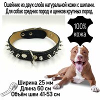 Ошейник из натуральной кожи с шипами для собак средних пород и щенков 25 мм*60 см, объём шеи 41-53 см. Два слоя натуральной кожи.