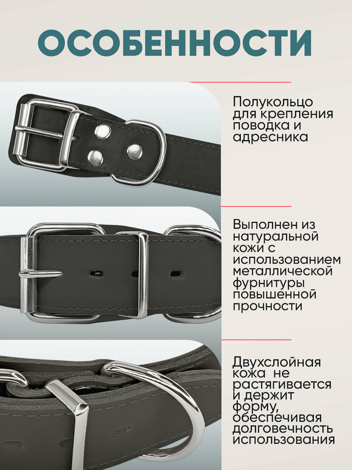 Кожаный ошейник для собак выполнен из двухслойной натуральной кожи с использованием фурнитуры повышенной прочности. Вставка из кожи препятствует попаданию шерсти во время застегивания, она не будет натирать, сковывать движения питомца, ношение будет комфортным. Полукольцо для крепления поводка и украшения (адресника). Дополнительное укрепление полукольца заклепкой обеспечивает высокую разрывную нагрузку изделия. Ошейник для собак из кожи - стильный прочный аксессуар. Ошейник для собак представлен в нескольких размерах, обратите внимание на название товара - в нем указан обхват шеи питомца. Анатомические ошейники для собак продуманы и созданы вручную из кожи Российского производства. Нейлоновые нити повышенной прочности в цвет изделия - классический стиль, подтвержденный временем. Ошейник упакован в подарочную упаковку - прочный пластиковый мешочек, который можно использовать для хранения мелочей в доме. Размеры: Обхват шеи регулируется от 50 до 60 см. Ширина ошейника 40 мм. Вес ошейника 195 грамм. Состав: натуральная кожа, металл, нить нейлоновая. пряжка никель