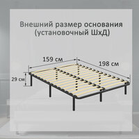 Размер спального места: 1600*2000 мм; Внешний размер основания (установочный ШхД): 1590*1980 мм; Максимальная распределенная нагрузка на одно спальное место - до 140 кг; Габариты упаковки: 1195х400х70 мм; Инструкция, шестигранный ключ и комплектующие для сборки в комплекте.