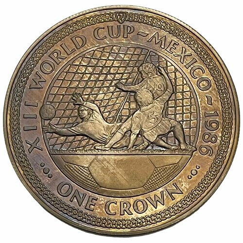 Аверс 1986 ELIZABETH II ISLE OF MANТретий портрет королевы Елизавет II легенда по кругуРеверс ONE CROWN XIII WORLD CUP MEXICO 1986Нападающий забивает голАвтор Raphael David Maklouf
