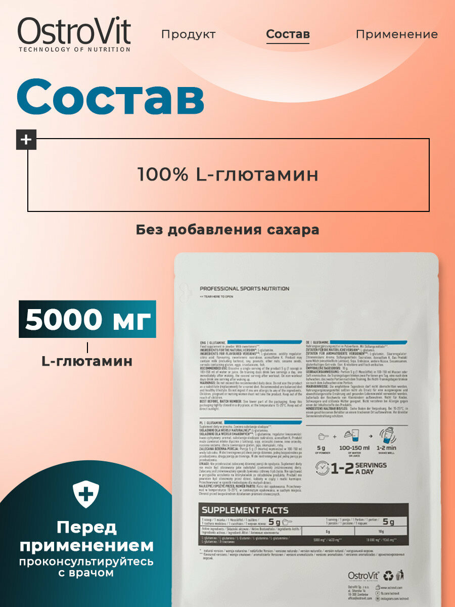 Купить OstroVit Glutamine, Глютамин для иммунитета, пищеварения, Аминокислота для набора мышечной массы, порошок 500 г с доставкой по всей России.