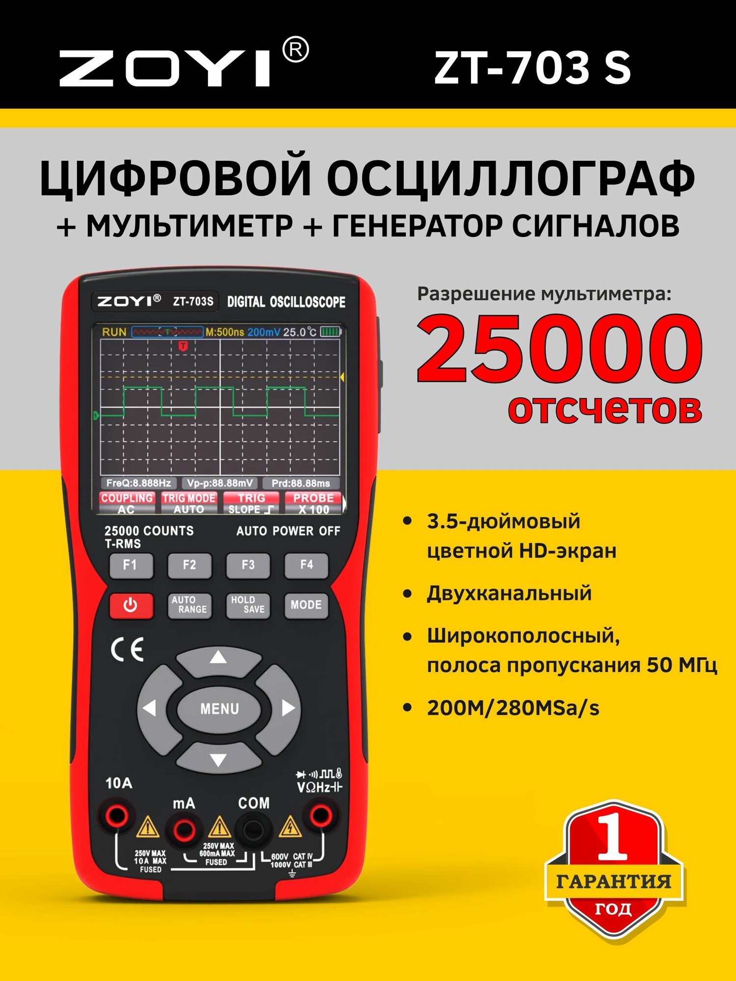Многофункциональный прибор ZT-703S производства компании ZOYI объединяет в себе 2-х канальный осциллограф, генератор сигналов и мультиметр. Прибор оснащен большим 3.5-дюймовым цветным дисплеем по технологии IPS с высоким разрешением, обеспечивающий четкое и наглядное представление измеряемых параметров. Интуитивно понятный интерфейс и множество настроек, позволяют легко управлять прибором и адаптировать его под различные задачи. Он имеет встроенный генератор сигналов для тестирования и калибровки электронных устройств. Реализована возможность сохранения данных измерений через порт USB Type C. Питание осуществляется от встроенного литий-ионного аккумулятора 3400 мА/ч. Осциллограф имеет небольшой размер, малый вес и удобен в эксплуатации. Он подойдет как начинающим радиолюбителям, так и опытным профессионалам. Прочный корпус с защитой от пыли и влаги, обеспечивает надежную эксплуатацию в различных условиях.
