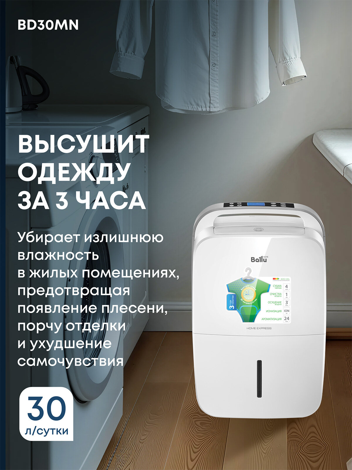 Осушитель воздуха Ballu BD30MN, гигростат, ионизация, 5 режимов, белый: сравнение цен, характеристики, фото, актуальное наличие и цены.