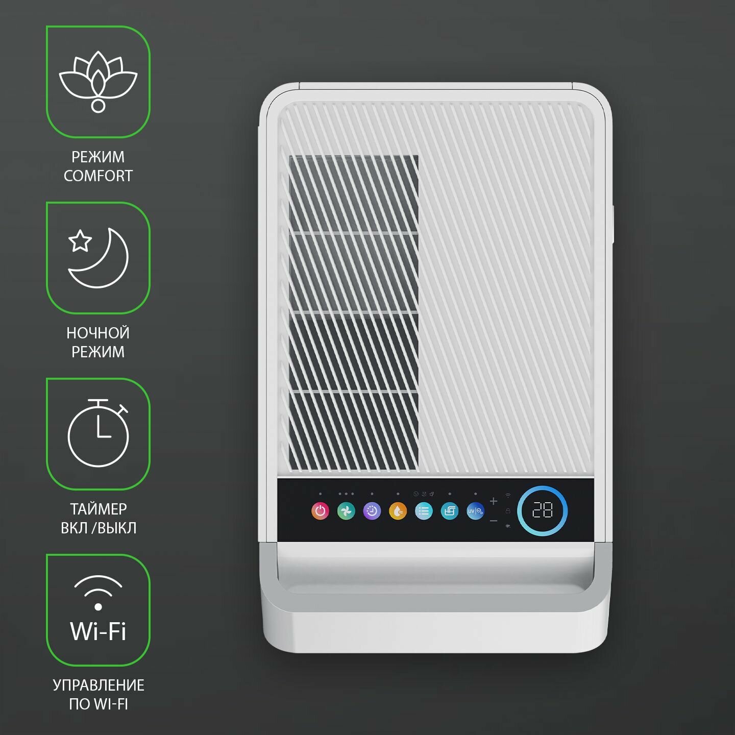 | Особенности | встроенный гигрометр, встроенный гигростат, дисплей, колёса, ручка для переноски |
