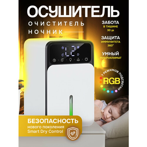 Осушитель воздуха для дома — помощник в борьбе с излишней влажностью, плесенью, сыростью, грибком. Универсальный осушитель - бытовая техника идеален в различных условиях: будь то квартира, дача или загородный дом. Особенно актуален он будет в таких помещениях, как ванная комната, гараж, подвал, где часто возникают проблемы с влажностью. С вместительным баком на 1500 мл осушитель способен работать до 5 дней без необходимости опустошения, что делает его очень удобным в эксплуатации. Кроме того, благодаря низкому уровню шума от 30 дБ, устройство практически незаметно в быту и не мешает повседневной жизни. Осушитель воздуха не только эффективно удаляет лишнюю влагу из воздуха, но и предотвращает развитие плесени и неприятных запахов, что делает его идеальным решением для создания здорового и комфортного микроклимата в доме, кухне. Подойдет для людей, страдающих аллергией и респираторными заболеваниями, поскольку сухой воздух значительно уменьшает риск развития аллергических реакций и улучшает общее самочувствие. Благодаря портативности, осушитель легко перемещать между разными помещениями, что делает его особенно полезным в больших домах или на дачах. Мини-осушитель станет вашим надежным помощником в поддержании идеального баланса влажности, обеспечивая защиту вашего интерьера и здоровья. Рекомендуется перед покупкой проверить уровень влажности в квартире или помещении с помощью датчик влажности воздуха. Осушитель, обеспечит вам и вашим близким более сухой, свежий и здоровый воздух в доме, даче или любом другом помещении, где требуется контроль влажности. Данный осушитель воздуха оснащен дополнительными функциями для вашего удобства и комфорта: RGB многоцветная подсветка создает приятную атмосферу, таймер позволяет настроить время работы устройства, ночной режим и режим сна обеспечивают тихую работу в ночное время, автоматическое отключение гарантирует безопасность при достижении максимального уровня воды в баке, а защита от перелива предотвращает вытекание воды.