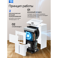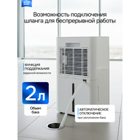 автоматическое размораживание, автоотключение при заполнении ёмкости конденсатом, автоотключение при сильном наклоне, ионизация воздуха, регулировка направления воздушного потока, регулировка скорости вентилятора, режим сушки белья, установка времени включения, установка времени отключения