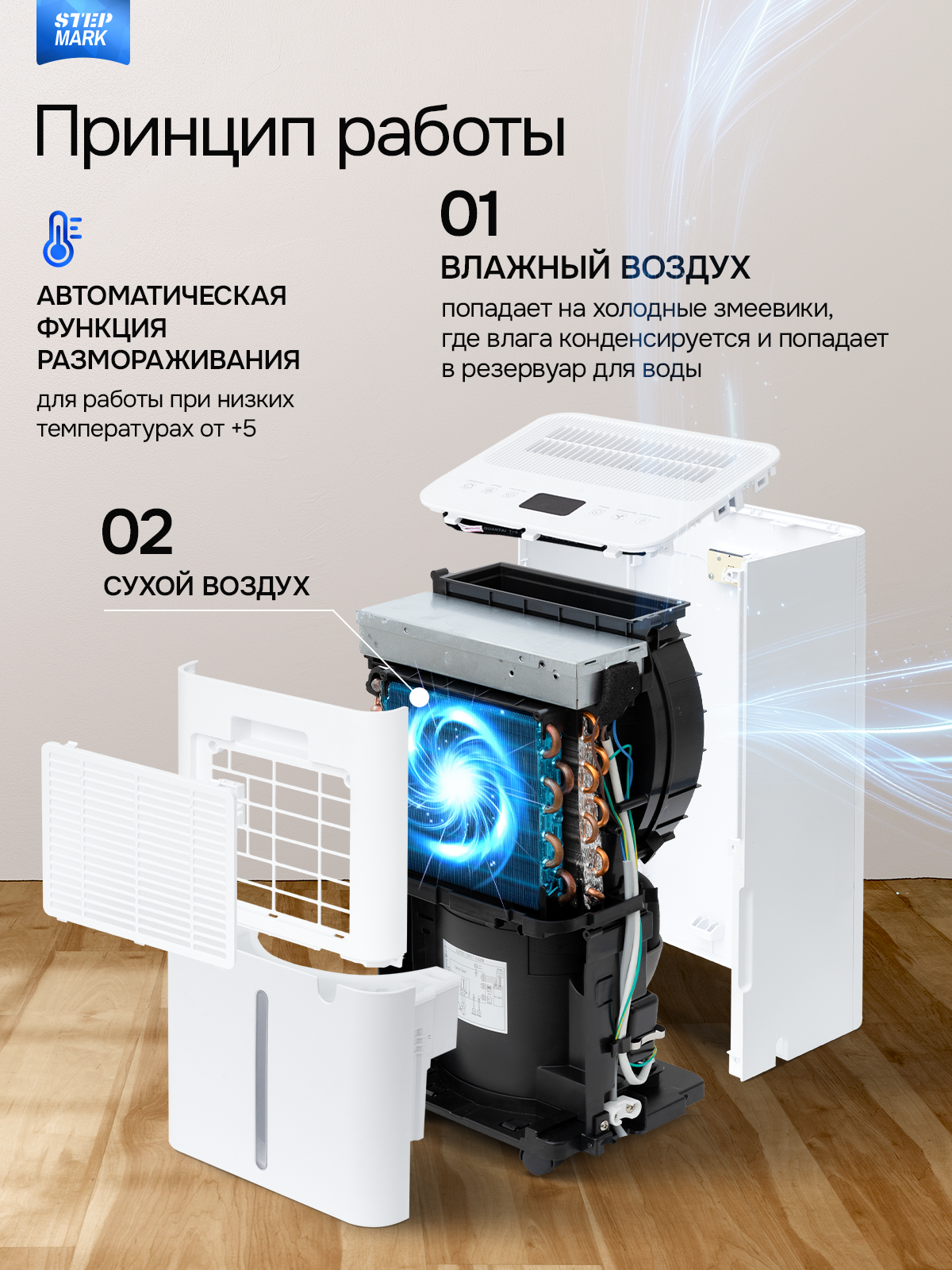 встроенный гигрометр, датчик утечки воды, дисплей, колёса, ручка для переноски, сенсорное управление