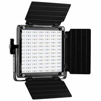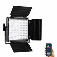 Осветительное устройство имеет регулируемую цветовую температуру от 3200 до 5600K. Лампа оснащена 168 светодиодами и 84 RGB светодиодами. Шторки в комплекте позволяют регулировать луч света для получения необходимой площади освещения.