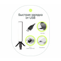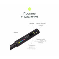 Световой поток: 800 лм Мощность: 7 Вт Количество светодиодов: 184 (69 белых, 69 желтых и 46 RGB) Цветовая температура: 2500-9000К ± 200, RGB 0-360° Регулировка мощности: 1-100% (плавная) Встроенный аккумулятор: 3000mAh, 3.7V Питание: USB Type-C Крепления: 1/4", мини-штатив CRI: 95+ Угол рассеивания: 120° Управление: ручное Время работы: 2 часа на полной мощности Время зарядки: 2.5 часа Размер: 200х41х37 мм Вес: 157 гр