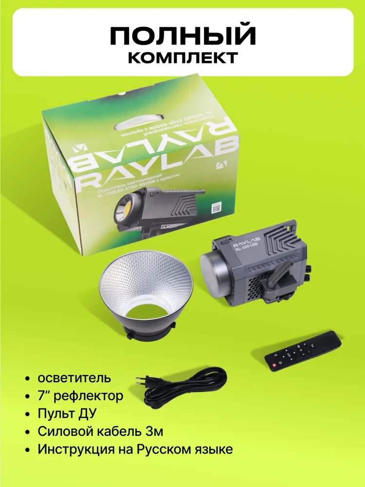 Raylab RL-100LED это компактный светодиодный моноблок, который станет отличным выбором для создания качественного видео-контента в домашних условиях, на выездной съемке или в студии. Небольшой размер и высокая мощность позволяет использовать его как для заполняющего, так и для контрового освещения. Прибор имеет большой яркий ЖК дисплей, широкий диапазон регулировки цветовой температуры, встроенные специальные эффекты и пульт ДУ в комплекте. Коэффициент цветопередачи профессионального уровня 96+ позволяет сохранить естественные цвета на ваших кадрах. Срок службы светодиодного COB элемента до 50 000 часов. В комплекте имеется стандартный 7-дюймовый рефлектор. Длина силового кабеля - 3 метра. В комплекте: осветитель, рефлектор, пульт ДУ, кабель питания, инструкция на русском языке. Батарейки для пульта (2шт ААА) в комплект не входят!