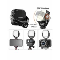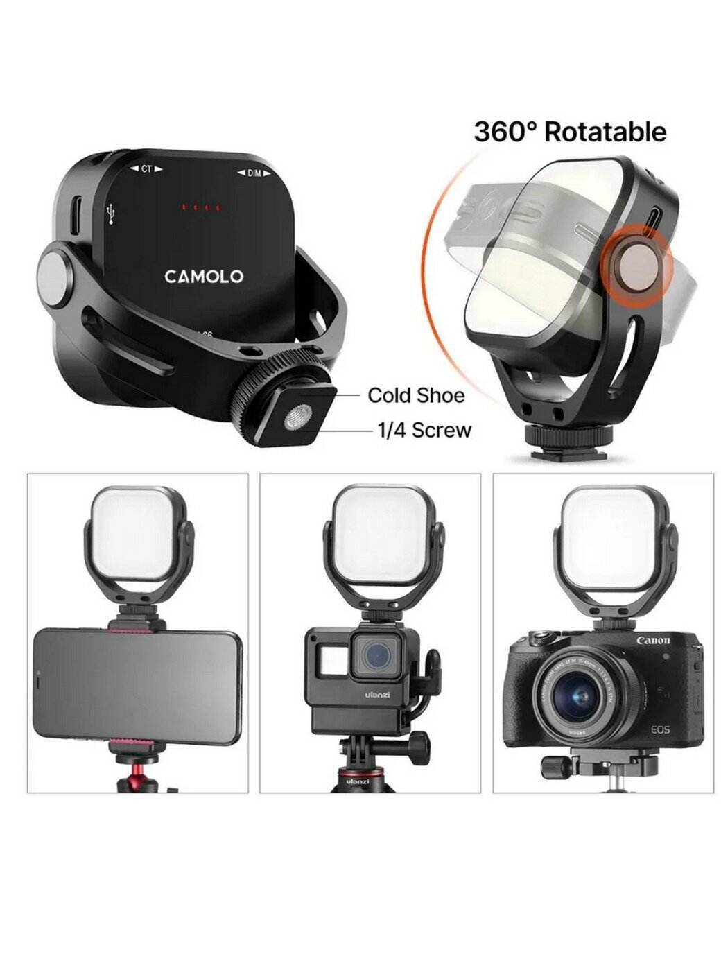 Миниатюрный светодиодный осветитель со встроенным наклонным крепление типа «лира», аккумулятором 2000 мАч и изменяемой температурой белого света. Можно установить в башмак камеры или на стандартный штативный винт 1/4". Аккумулятор емкостью 2000 мАч обеспечивает 2 часа работы при максимальной яркости.