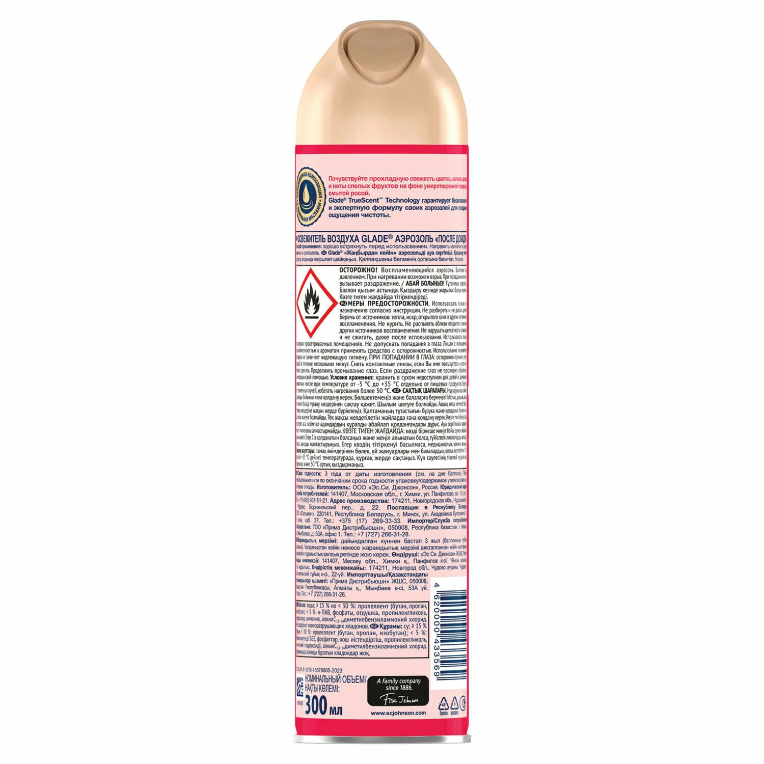 | Состав | вода, бутан/пропан/изобутан менее 15% но более 30%, н-ПАВ <5%, фосфонаты <5%, отдушка, растворитель, водный раствор аммиака, консервант, линалоол |