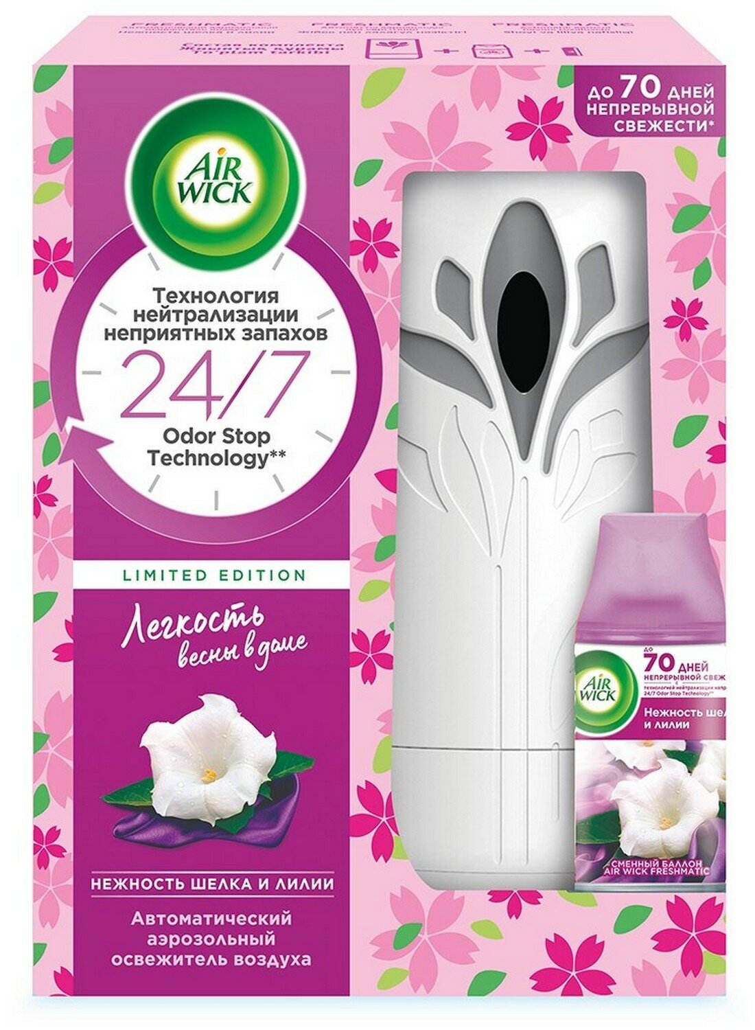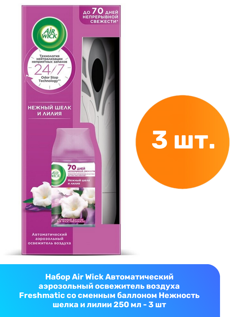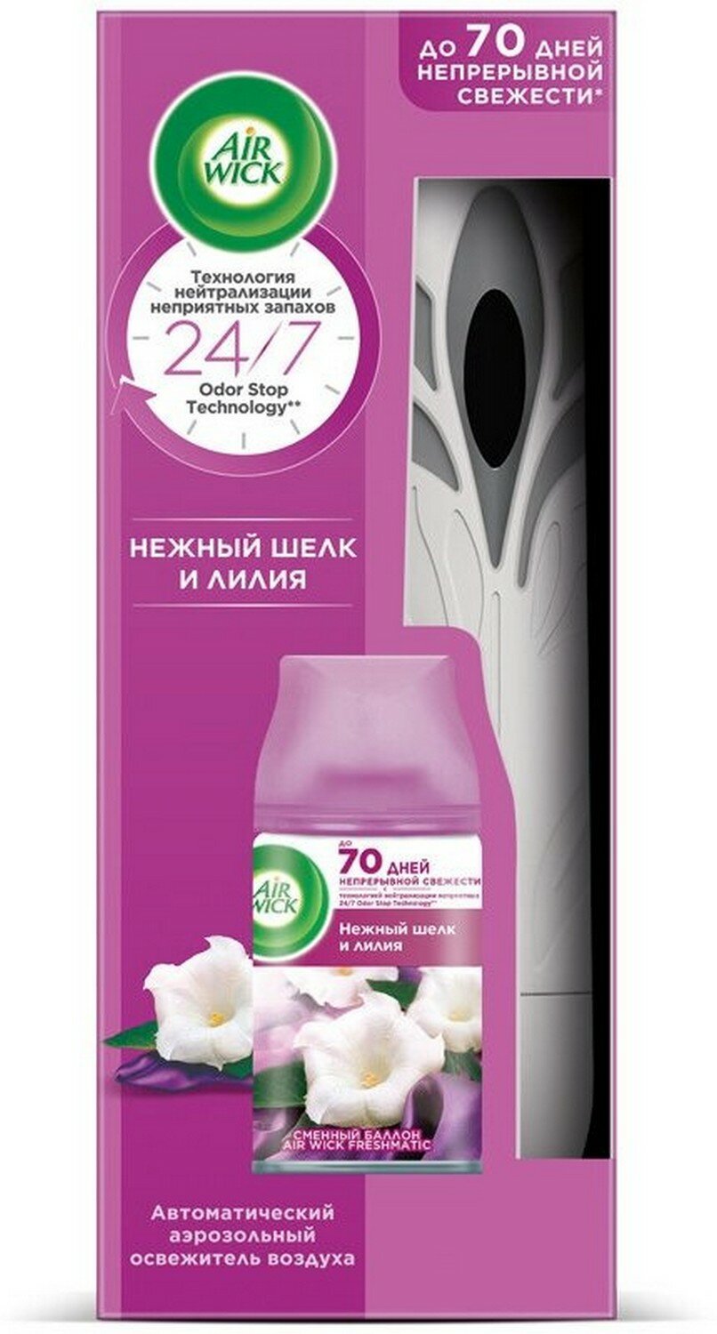 Air Wick Автоматический аэрозольный освежитель воздуха Freshmatic со сменным баллоном Нежность шелка и лилии 250 мл — 3 шт: сравнение цен, характеристики, фото, актуальное наличие и цены.