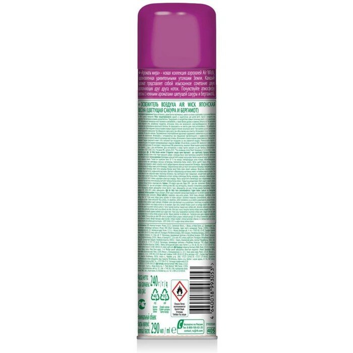 Аэрозоль-освежитель воздуха Air Wick Японская весна (Цветущая сакура и Бергамот), 290 мл, из новой коллекции "Ароматы мира" эффективно борется с неприятными запахами, создавая весеннюю атмосферу с нежными ароматами цветущей сакуры и бергамота. Преимущества Air Wick: 1. Эффективно борется с неприятными запахами, создавая весеннюю атмосферу с нежными ароматами цветущей сакуры и бергамота; 2. Эффективно избавит дом от неприятных запахов (На основании отчета Рекитт Бенкизер от 12.10.2018 (г. Халл, Великобритания)); 3. Не оставит следов на мягкой мебели при неаккуратном использовании; 4. Наполнит комнату естественными ароматами природы, благодаря современной формуле поглощения запахов AirWick; 5. Не содержит в составе опасных для здоровья компонентов и подходит для постоянного использования. Правила использования: Хорошо встряхнуть, держа баллон вертикально, нажать на клапан и распылить содержимое баллона от себя к центру помещения. Меры предосторожности: Внимание: Прочитать внимательно этикетку перед использованием. Хранить в недоступном для детей и животных месте. Использовать с осторожностью при повышенной чувствительности к парфюмерным отдушкам (запахам). Освежители воздуха не являются заменой надлежащих мер гигиены. Использовать только в хорошо проветриваемых помещениях. Может вызывать аллергическую реакцию! Баллон находится под давлением. При нагревании возможен разрыв баллона. Предохранять от воздействия прямых солнечных лучей и нагревания выше 50ºС. Экстремальные температуры могут возникать в автомобилях, а также вблизи духовок и каминов. Огнеопасно! Не распылять вблизи открытого огня, раскаленных предметов, источников тепла или включенного электрооборудования. Не курить в помещении при использовании аэрозольного баллона. Не прокалывать и не сжигать даже после использования. Не разбирать и не давать детям. При попадании в глаза осторожно промыть водой в течение нескольких минут. При наличии удалить контактные линзы и продолжить промывание. При обращении к врачу иметь при себе упаковку или этикетку. Использовать только по прямому назначению. Не вдыхать аэрозоль! теги: Эрвик, Эйрвик, ароматический спрей для дома, освежитель для туалета, нейтрализатор запаха, аэрозольный баллон, аромат для дома, для туалета, для квартиры, для ванной, для комнаты, airwick, подарок для мамы, для бабушки. Состав: 15% или более, но менее 30%: пропеллент (смесь бутана, пропана, изобутана); менее 5%: консервант, неионогенные ПАВ, ароматизатор, линалоол.
