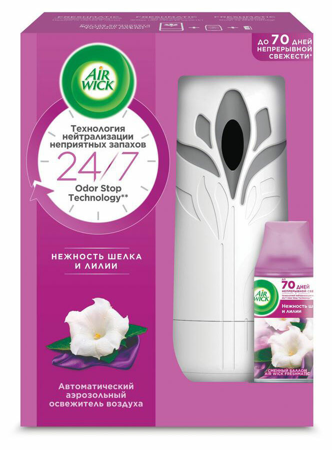 Автоматический освежитель воздуха Air Wick Freshmatic – это небольшое стильное устройство, которое автоматически борется с неприятными запахами* день за днём. Аромат "Нежность шелка и лилии" наполнит Ваш дом изысканными нотками лилии и нежного шелка. Вставьте сменный баллон в элегантное устройство, выберите интенсивность распыления и наслаждайтесь изысканными ароматами Air Wick! Состав набора: - Автоматический распылитель воздуха - Сменный баллон "Нежность шелка и лилии" - 2 батарейки АА. Преимущества автоматического освежителя Air Wick Freshmatic: - 3 режима интенсивности распыления аромата - До 60 дней свежести** - 1 спрей освежает целую комнату*** - Удобно вешать на стену, размещать на полке или ставить на шкаф. *На основании отчета исследовательского центра Рекитт Бенкизер (Халл, Великобритания) от 23 августа 2018 года в отношении запахов в туалете, на кухне, а также животных. **Эффективен до 60 дней при низком уровне интенсивности аромата и нормальных условиях окружающей среды. ***1 спрей освежает помещение объемом 28 м3 согласно данным исследовательского центра Рекитт Бенкизер, отчет №зк-14-04-02 от 27.03.2014 г.